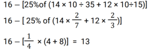 Simplification (Railway Maths) (701 to 750)Total Questions: 5021. (0.1² − 0.0252²) ÷ (0.1 − 0.025) = ______ [ALP Tier II 23/01/2019 (Morning)](a) 0.25(b) 0.625(c) 0.325(d) 0.125Correct Answer: (d) 0.125Solution:22. If 5x/2 - 1/4 (6x - 5/3) = 7/6 then the value of x is______. [ALP Tier II 23/01/2019 (Morning) ](a) 5/7(b) 5/4(c) 3/7(d) 3/4Correct Answer: (d) 3/4Solution:23. Solve the following. [ALP Tier II 23/01/2019 (Afternoon) ]√0.2025 + √0.12225 = _______(a) 0.9(b) 0.6(c) 0.8(d) 1.2Correct Answer: (c) 0.8Solution:24. If 5x/3 - 7/2 (2x/5 - 1/3) = 1/3, then the value of x is______ [ALP Tier II 23/01/2019 (Afternoon) ](a) 1.25/8(b) -5/14(c) -25/8(d) 5/14Correct Answer: (c) -25/8Solution:5x/3 − 7/2 ( 2x/5 − 1/3 ) = 1/3 → 5x/3 − 7/2 ( (6x − 5) / 15 ) = 1/3 → (50x − 42x + 35) / 30 = 1/3 → 8x = −25 ⇒ x = −25/825. Find the value of the given expression: 16 - (25% of (14 x 10 ÷ 35 + 12 x 10 ÷ 15)) [ALP Tier II 23/01/2019 (Afternoon) ](a) 9(b) 13(c) 7(d) 11Correct Answer: (b) 13Solution:26. The value of (0.12 x 0.12 x 0.12) x (1.32 x 1.32 x 1.32)/(0.52 x 0.52) : [ALP Tier II 08/02/2019 (Morning) ](a) 0.187(b) 0.0187(c) 0.0147(d) 0.147Correct Answer: (c) 0.0147Solution:(0.12 × 0.12 × 0.12) × (1.32 × 1.32 × 1.32) / (0.52 × 0.52) = 0.014727. The value of –7 (2x + 4y) –2 (x – 2y) is: [ALP Tier II 08/02/2019 (Morning) ](a) -4(2x + 3y)(b) -8(2x + 3y)(c) -8(2x - 3y)(d) -3(2x + 3y)Correct Answer: (b) -8(2x + 3y)Solution:−7 (2x + 4y) − 2 (x − 2y)= −16x − 24y= −8 (2x + 3y)28. find the unknown (?) number: [ALP Tier II 08/02/2019 (Morning) ]0.088 / (?) = 0.02(a) 4.2(b) 3.4(c) 4.4(d) 3.2Correct Answer: (c) 4.4Solution:0.088 / x = 0.02 ⇒ x = 8.8 / 2 = 4.429. The square root of (10 + √25) (12 – √49) is: [ALP Tier II 08/02/2019 (Morning) ](a) 4√3(b) 5√3(c) 3√3(d) 2√3Correct Answer: (b) 5√3Solution:30. If x = 15, y = 20 and z = 10 then the value of (5x – 15) / (y + Z) is equal to_______: [ALP Tier II 08/02/2019 (Morning) ](a) 2(b) 3(c) 4(d) 6Correct Answer: (a) 2Solution:(5x − 15) / (y + z) = (5 × 15 − 15) / (20 + 10) = 60 / 30 → 2Submit Quiz« Previous12345Next »