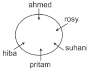 Sitting Arrangement – Railway Reasoning part – 4Total Questions: 5011. A, B, C, D, E and F are sitting around a circular table facing the centre. A is sitting second to the right of C. B is sitting to the immediate left of F. C is an immediate neighbour of both D and F. Who is sitting second to the left of B? [Group - D 27/09/2022 (Afternoon)](a) A(b) E(c) C(d) FCorrect Answer: (a) ASolution: We can clearly see that A is sitting second to the left of B.12. Six persons (L, M, N, O, P and Q are sitting around a circular table facing the centre. Q is sitting second to the right of N. P is sitting second to the left of M. Q is an immediate neighbour of L and P. L is sitting second to the right of M. Who is sitting third to the left of O? [Group - D 27/09/2022 (Afternoon) ](a) N(b) L(c) P(d) QCorrect Answer: (b) LSolution: We can clearly see that L is sitting third to the left of O.13. Five friends, Hiba, Suhani, Pritam, Ahmed, and Rosy are sitting around a circular table facing the centre. Rosy is second to the right of Pritam, and is an immediate neighbour to both Suhani and Ahmed. If Ahmed is second to the left of Pritam, where is Hiba seated? [Group - D 27/09/2022 (Evening)](a) Second to the right of Suhani(b) To the immediate left of Suhani(c) Second to the left of Suhani(d) Third to the left of SuhaniCorrect Answer: (c) Second to the left of SuhaniSolution:Now, we can clearly see that Hiba is second to the left of Suhani.14. Six friends, A. B, C, D, E, and F are sitting around a circular table facing the centre. C is the immediate neighbour of A and E. F is second to the right of C and third to the left of A. If B is second to the left of C, where is D seated? [Group - D 28/09/2022 (Morning)](a) Fourth to the right of C(b) Third to the right of E(c) Second to the left of A(d) Second to the left of BCorrect Answer: (c) Second to the left of ASolution: We can clearly see that D is seated second to the left of A.15. A certain number of people are sitting in a row, facing north. No one is sitting to the right of E. Only two people are sitting to the left of B. D is sitting third to the right of B. Only four people are seated between B and F. Only eight people are seated between D and C. E is seated second to the right of C. If no other person is sitting in the row, what is the total number of persons seated? [Group - D 28/09/2022 (Morning)](a) 17(b) 22(c) 21(d) 16Correct Answer: (a) 17Solution:Total number of persons seated = 1716. A certain number of people are sitting in a row and facing north. U is sitting 4ᵗʰ to the right of S. V is sitting 5ᵗʰ from the right end. V is seated at the immediate right of U. If no other person in the row. What is the total number of persons seated? [Group - D 28/09/2022 (Afternoon)](a) 4(b) 10(c) 11(d) 8Correct Answer: (b) 10Solution:17. Six friends are sitting around a round table facing the centre with equal distances between two neighbours. Wasim is second to the right of Muskan. Ekta is sitting to the immediate left of Rohit. Anushri is sitting third to the left of Wasim. Suresh is the second to the left of Ekta. Who is to the immediate right of Wasim? [Group - D 28/09/2022 (Afternoon)](a) Rohit(b) Ekta(c) Muskan(d) SureshCorrect Answer: (b) EktaSolution:We can clearly see that Ekta is sitting immediate right of Wasim.18. A certain number of people are sitting in a straight line facing north. Only three people are sitting between D and I. There are only two people sitting between K and O. I is sitting to the immediate left of O. No one is sitting to the left of D. Only one person is sitting to the right of O. How many people are sitting in the row? [Group - D 28/09/2022 (Evening)](a) 6(b) 5(c) 8(d) 7Correct Answer: (d) 7Solution:We can see that there are 7 people in the row19. Six teachers are sitting around a circular table facing the centre. Ruhi is sitting second to the left of Sophie. Gautam is sitting third to the right of Dinesh. Preeti is an immediate neighbour of both Sophie and Gautam. Mary is sitting to the immediate left of Ruhi. Who is an immediate neighbour of both Ruhi and Sophie? [Group - D 28/09/2022 (Evening)](a) Gautam(b) Preeti(c) Dinesh(d) MaryCorrect Answer: (c) DineshSolution:Dinesh is immediate neighbour of both Ruhi and Sophie.20. A certain number of people are sitting in a row, facing north. B is sitting third to the right of C. No one is sitting to the left of C. Only four people are sitting between A and B. Only two people are seated to the right of D. Only four people are sitting between A and D. If no other person is sitting in the row, what is the total number of persons seated between C and D ? [Group - D 28/09/2022 (Evening)](a) 13(b) 15(c) 17(d) 12Correct Answer: (d) 12Solution:Total 12 people are sitting between C and D.Submit Quiz« Previous12345Next »