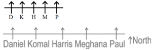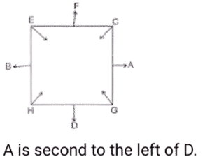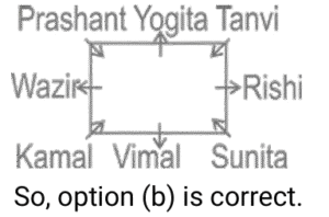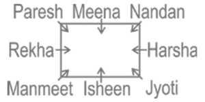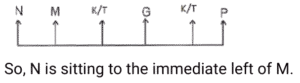 Sitting Arrangement – Railway Reasoning part – 5Total Questions: 5011. Six students P,K,M,T,N and G are sitting on a straight bench facing east, K and T are the immediate neighbours of G. P is sitting at one of the extreme ends and is fourth to the right of M. Who is sitting to the immediate left of M? [Level 2 (13/06/2022) Shift 1 ](a) N(b) G(c) K(d) TCorrect Answer: (a) NSolution:12. Seven friends A, B, C, D, E, F and G are sitting facing the center in a circular position. F is sitting to the immediate right of C. C is at the second position to the right of G. E is sitting at the third position to the right of A. B is an immediate neighbour of both D and E. Which of the following statements is FALSE? [Level 2 (13/06/2022) Shift 2](a) C is sitting at the third position to the right of D(b) A is sitting to the immediate left of C.(c) B is sitting to the immediate right of G(d) E is sitting at the third position to the left of G.Correct Answer: (c) B is sitting to the immediate right of GSolution:According to the option, Only (c) is incorrect.13. Five friends Komal, Harris, Paul, Daniel and Meghana are standing in a row facing north but not necessarily in the same order. Only Harris is between Komal and Meghana. Paul is to the immediate right of Meghana. Daniel is to the immediate left of Komal. Which of the following statements is true? [Level 2 (13/06/2022) Shift 2 ](a) Daniel is third to the left of Meghana.(b) Harris is to the right of Meghana(c) Harris is to the left of Komal(d) Komal is third to the left of Harris.Correct Answer: (a) Daniel is third to the left of Meghana.Solution:All are facing north. According to the option, only statement (a) is true.14. Seven friends K, L, M, N, O, P and Q are sitting on a straight bench facing north. M and Q are not sitting at any of the extreme ends. K is sitting exactly at the middle position. Only P is sitting between Q and N. L is sitting third to the right of K. K is sitting to the immediate left of O. [Level 2 (13/06/2022) Shift 2]Who is sitting at the extreme left end?(a) O(b) Q(c) N(d) LCorrect Answer: (c) NSolution:All are facing towards North N P Q K O M L ↑ “N” is sitting at the extreme left.15. Eight friends are sitting around a square table, four at the corners and four in the middle of the four sides, facing the centre. Isheen is an immediate neighbour of Manmeet and Jyoti. Only three people sit between Harsh and Rekha. Nandan is sitting third to the right of Isheen. Paresh is second to the left of Manmeet . Only three people sit between meena and Isheen. Manmeet is sitting to the immediate right of Rekha. Who is second to the right of Nandan? [Level 3 (14/06/2022) Shift 1 ](a) Rekha(b) Meena(c) Paresh(d) JyotiCorrect Answer: (c) PareshSolution:So, Second to the right of Nandan = Paresh16. During lunch break, eight colleagues, namely A,B,C,D,E,F,G and H are sitting in a circle facing the centre at equal distance . B is an immediate neighbor of both G and D. C is an immediate neighbor of both A and G. H is third to the left of B , E is not an immediate neighbor of A. Who is third to the right of E? [Level 3 (14/06/2022) Shift 1](a) G(b) A(c) D(d) BCorrect Answer: (a) GSolution:17. A,B,C,D,E,F,G and H are sitting around a square table; four of them sit at the 4 corners, while four sit at the middle of the sides . The ones who sit at the corners face the centre, while those who sit at the middle of the sides face outside . F sits fourth to the left of D. D faces outside.C is immediate to the right of F. A sits third to the right of the H. only two persons sit between G and B. E is to the immediate right of B and to the immediate left of F. H sits second to the right of the E. What is the position of A with respect to D. [Level 3 (14/06/2022) Shift 1](a) Fourth to the right(c) Third to the left(b) Second to the left(d) Third to the rightCorrect Answer: (b) Second to the leftSolution:18. Five candidates J, K, L, M, and N are sitting in the same row, facing north waiting to be interviewed by the HR Manager. N is to the left of K. L is an immediate neighbour of both K and J. If J is fourth from the left, then how far is N from the right? [Level 3 (14/06/2022) Shift 2 ](a) 2ⁿᵈ from the right(b) 4ᵗʰ from the right(c) 5ᵗʰ from the right(d) 3ʳᵈ from the rightCorrect Answer: (c) 5ᵗʰ from the rightSolution:All are facing North ↑ N K L J M So, N is 5th from the right.19. Prashant, Kamal, Rishi, Sunita, Tanvi, Vimal, Wazir and Yogita are sitting at a square table in such a way that four of them are sitting at four corners of the table, while the other four are sitting in the middle of each of four sides of the table. The four who are sitting at the corners of the table are facing the centre, whereas those who are sitting in the middle of the sides of the table are facing outside. Prashant, who is facing the centre, is sitting third to the right of Vimal. Tanvi, who is facing the centre, is not an immediate neighbour of Vimal. Only one person is sitting between Vimal and Wazir. Sunita sits second to the right of Kamal. Kamal is facing the centre. Rishi is not an immediate neighbour of Prashant. Which of the following statements regarding Kamal is true? [Level 3 (14/06/2022) Shift 2 ](a) Kamal is an immediate neighbour of Yogita(b) Kamal is an immediate neighbour of Vimal(c) Kamal is sitting the immediate right of Tanvi(d) Kamal is an immediate neighbour of both Tanvi and Sunita.Correct Answer: (b) Kamal is an immediate neighbour of VimalSolution:20. Eight friends are sitting around a square table, four at the corners and four in the middle of the four sides. All of them are facing the centre. Cindy is an immediate neighbour of both LEO and Roger. Both Leo and Roger are sitting at the corners. Only three people sit between Kate and Dylan. Ben is second to the right of Leo. Cindy is second to the right of Dylan. Only three people sit between Louis and Cindy. Myra is second to the left of Roger. Who is sitting to the imme