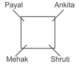 Sitting Arrangement – Railway Reasoning part – 6Total Questions: 5021. Six girls are sitting in a circle facing each other. Hina is sitting on the right of Mahak. Ela is on the right of Hina. Seema is on the left of Mahak. Rani is sitting between Priya and Seema. Where is Priya sitting? [RRB NTPC 31/01/2021 (Morning) ](a) Between Hina and Mahak(b) Between Ela and Rani(c) Between Rani and Seema(d) Between Seema and ElaCorrect Answer: (b) Between Ela and RaniSolution:22. Eight siblings, L, M, N, O, P, Q, R and S are sitting around a circular table facing away from the centre and at equal distance from the other , but not in the same order. S sits second to the left of P. M sits third to the right of S. R is M’s immediate neighbour and is sitting second to the left of L. N is an immediate neighbour of R. O’s back faces the back of N.Q sits to the immediate right of L. Who sits to the immediate right of O? [RRB NTPC 31/01/2021 (Evening)](a) Q(b) P(c) S(d) RCorrect Answer: (b) PSolution:23. A, B, C, D, and E are sitting on a bench. A and B are sitting next to each other and so are C and D. D is sitting at the extreme left end of the bench and A is sitting at the centre. E is sitting next to B. In which position is A sitting? [RRB NTPC 31/01/2021 (Evening)](a) Between C and E(b) Between B and D(c) Between B and E(d) Between B and CCorrect Answer: (d) Between B and CSolution:24. Six friends, A,B,C,D,E and F, sitting around a hexagonal table, each at one side, are facing the centre of the table. A is second to the left of F. B is the neighbour of C and D. E is second to the left of D. Who is the third person sitting to the left of B? [RRB NTPC 01/02/2021 (Morning)](a) E(b) A(c) F(d) CCorrect Answer: (a) ESolution:25. Four friends, Ankita, Shruti, Payal and Mehak, are sitting at a rectangular table, each at one corner. Ankita is sitting to the right of Shruti, who is sitting diagonally opposite to Payal. Where is Ankita sitting with respect to Mehak? [RRB NTPC 01/02/2021 (Evening)](a) Directly opposite(b) Diagonally opposite(c) Immediate right(d) Immediate leftCorrect Answer: (b) Diagonally oppositeSolution:Ankita is sitting diagonally opposite to Mehak.26. M1, M2, M3, M4 and M5 are five men sitting in a line facing towards the South. L1, L2, L3, L4 and L5 are five women sitting in a second line, parallel to the first line, facing towards the north. M2, who is to the immediate left of M4, is opposite to L5. M3 and L2 are diagonally opposite each other M5 is opposite L3, who is to the immediate right of L1 ,L4, who is to the immediate right of L3, is opposite M4. L1 is at one end of the line. Which of the following pairs are diagonally opposite each other? [RRB NTPC 01/02/2021 (Evening) ](a) M5 and L3(b) M1 and L2(c) M3 and L1(d) M1 and L1Correct Answer: (d) M1 and L1Solution:From the above arrangement, we can see that M1 and L1 are sitting diagonally opposite each other.27. Six persons, M1,M2,M3, M4, M5 and M6 are sitting in a row facing towards the north (not necessarily in the same order). Only three people sit between M2 and M3 . M3 is sitting to the immediate left of M5. Only three people sit between M1 and M5. M4 sits to the immediate left of M6 and is to the right of M3. How many people are sitting between M3 and M6? [RRB NTPC 03/02/2021 (Morning)](a) One(b) Two(c) Zero(d) ThreeCorrect Answer: (b) TwoSolution:28. Seven persons P,Q, R,S, A, B, and D are sitting one above the other on a ladder (not necessarily in the same order). B sits neither at the top nor at the bottom. Only four persons sit between P and R. S sits immediately above A. Only one person sits between R and D. D sits below S. B sits above Q. Three of the following are similar in certain way based on their seating arrangement and from a group, which of the following does not belong to that group? [RRB NTPC 03/02/2021 (Morning)](a) S D(b) B Q(c) P A(d) D BCorrect Answer: (d) D BSolution:29. Eight soldiers A, B, C, D, E, F, G and H are sitting in a row facing towards the north (not necessarily in the same order). D sits third to the right of A and second to the left of C. Only three soldiers sit between D and E. Only two soldiers sit between E and F. F sits second to the left of B. A is the neighbor of G. H sits to the right of D. How many soldiers are sitting between H and G? [RRB NTPC 09/02/2021 (Evening)](a) 1(b) 5(c) 0(d) 4Correct Answer: (d) 4Solution:30. Eight friends P, Q, R, S, T, U, V and W are sitting around a circular table facing opposite to the centre (not necessarily in the same order). Q is third to the right of T and second to the left of P. Only two friends are sitting between U and V and V is not the neighbor of P or T. W is second to the right of R. Which of the following statements is correct? [RRB NTPC 09/02/2021 (Evening)](a) P is to the immediate left of R.(b) S is to the immediate left of T(c) W is to the immediate right of Q(d) V is to the immediate right of SCorrect Answer: (d) V is to the immediate right of SSolution:Submit Quiz« Previous12345Next »