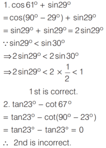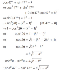 SOLVED PAPER 2020 (CDS) (II) (Elementary Mathematics)Total Questions: 10051. The difference between two angles is 15° and the sum of the angles in radian is 5π/12. The bigger angle is k times the smaller angle. What is k equal to?(a) 4/3(b) 3/2(c) 6/5(d) 7/6Correct Answer: (b) 3/2Solution:Let the angle be x and kx,52. Consider the following statements :(a) only 1(b) only 2(c) Both 1 and 2(d) Neither 1 nor 2Correct Answer: (b) only 2Solution:We have,53. A road curve is to be laid out on a circle. What radius should be used if the track is to change direction by 42° in distance of 44 m?(Assume π = ²²⁄₇ )(a) 60 m(b) 66 m(c) 75 m(d) 80 mCorrect Answer: (a) 60 mSolution:Given, θ = 42º54. What is the maximum value of 3sin θ - 4 ?(a) -4(b) -1(c) 0(d) 1Correct Answer: (b) -1Solution:55. If sin θ + cos θ = √2, then what is sin⁶θ + cos⁶θ + 6 sin²θ cos²θ equal to ?(a)(b)(c)(d)Correct Answer: (d)Solution:Given,56. What is the least value of 9sin²θ +16 cos²θ ?(a) 0(b) 9(c) 16(d) 25Correct Answer: (b) 9Solution:We have,57. If cos 47° + sin 47° = k then what is the value of cos² 47° - sin² 47° ?(a)(b)(c)(d)Correct Answer: (a)Solution:Given,58. If cosec θ - sin θ = p³ and sec θ - cos θ = q³, then what is the value of tan θ ?(a)(b)(c)(d)Correct Answer: (b)Solution:We have,59. If 0 ≤ α β ≤ 90° such that cos(α - β) = 1, then what is sin α - sin β + cos α - cos β equal to ?(a) -1(b) 0(c) 1(d) 2Correct Answer: (b) 0Solution:60. Consider the following statements.1. The value of cos 61° + sin 29° cannot exceed 1. 2. The value of tan 23° - cot 67° is less than 0.Which of the above statements is/are correct?(a) only 1(b) only 2(c) Both 1 and 2(d) Neither 1 nor 2Correct Answer: (a) only 1Solution:We have,Submit Quiz« Previous12345678910Next »
