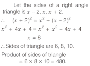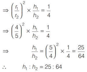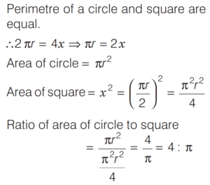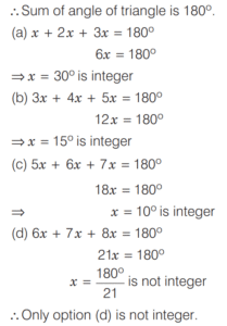 SOLVED PAPER 2020 (CDS) (II) (Elementary Mathematics)Total Questions: 10071. In a triangle, values of all the angles are integers (in degree measure). Which one of the following cannot be the proportion of their measures?(a) 1 : 2 : 3(b) 3 : 4 : 5(c) 5 : 6 : 7(d) 6 : 7 : 8Correct Answer: (d) 6 : 7 : 8Solution:In triangle, angle of triangle are integers.72. The length of a rectangle is increased by 10% and breadth is decreased by 10%. Then, the area of the new rectangle is(a) neither increased nor decreased(b) increased by 1%(c) decreased by 1%(d) decreased by 10%Correct Answer: (c) decreased by 1%Solution:Let the length of rectangle = 𝓍 m73. The surface areas of two spheres are in the ratio 1: 4. What is the ratio of their volumes?(a) 1 : 16(b) 1 : 12(c) 1 : 10(d) 1 : 8Correct Answer: (d) 1 : 8Solution: 74. The length, breadth and height of a brick are 20 cm, 15 cm and 10 cm respectively. The number of bricks required to construct a wall with dimensions 45 m length, 0.15 m breadth and 3 m height is(a) 12450(b) 11250(c) 6750(d) None of theseCorrect Answer: (c) 6750Solution:Given, l = 20 cm, b = 15 cm, h = 10 cm75. If the sum of all interior angles of a regular polygon is twice the sum of all its exterior angles, then the polygon is(a) Hexagon(b) Octagon(c) Nonagon(d) DecagonCorrect Answer: (a) HexagonSolution:Interior angle of regular polygon76. A bicycle wheel makes 5000 revolutions in moving 11 km. What is the radius of the wheel? (Assume π = ²²⁄₇)(a) 17.5 cm(b) 35 cm(c) 70 cm(d) 140 cmCorrect Answer: (b) 35 cmSolution:We have,77. The volumes of two cones are in the ratio 1 : 4 and their diameters are in the ratio 4 : 5. What is the ratio of their heights?(a) 25 : 64(b) 16 : 25(c) 9 : 16(d) 5 : 9Correct Answer: (a) 25 : 64Solution: 78. In a triangle ABC, if 2 ∠A = 3 ∠B = 6 ∠C, then what is ∠A + ∠C equal to ?(a) 90°(b) 120°(c) 135°(d) 150°Correct Answer: (b) 120°Solution:79. If the perimeter of a circle and a square are equal, then what is the ratio of the area of the circle to that of the square ?(a) 1 : π(b) 2 : π(c) 3 : π(d) 4 : πCorrect Answer: (d) 4 : πSolution:Given,80. The lengths of the sides of a right - angled triangle are consecutive even integers (in cm). What is the product of these integers?(a) 60(b) 120(c) 360(d) 480Correct Answer: (d) 480Solution:Submit Quiz« Previous12345678910Next »