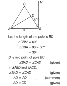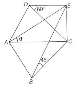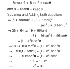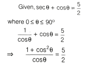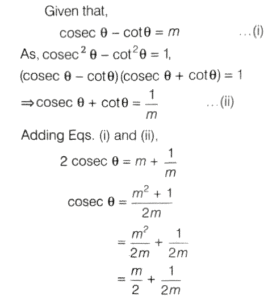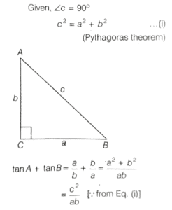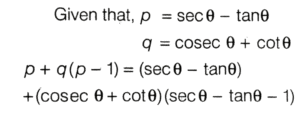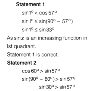 SOLVED PAPER 2021 (CDS) (I) (Elementary Mathematics)Total Questions: 10051. Consider the following inequalities1. sin 1° < cos 57° 2. cos 60° > sin 57°Which of the above is/are correct?(a) 1 only(b) 2 only(c) Both 1 and 2(d) Neither 1 nor 2Correct Answer: (a) 1 onlySolution:As sin x is an increasing function in 1st quadrant, Statement 2 is incorrect. Hence, only Statement 1 is true.52. If p = secθ - tanθ and q = cosecθ + cotθ, then what is p + q(p - 1) equal to?(a) - 1(b) 0(c) 1(d) 2Correct Answer: (a) - 1Solution: 53. If cosecθ - cotθ = m, then what is cosecθ equal to?(a)(b)(c)(d)Correct Answer: (d)Solution:54. Let ABC be a triangle right angled at C, then what is tan A + tan B B equal to?(a)(b)(c)(d)Correct Answer: (d)Solution:55. Let cos α + cos β = 2 and sin α + sin β = 0, where 0 ≤ α <= 90°, 0 ≤ β ≤ 90° What is the value of cos 2α - cos 2β ?(a) 0(b) 1(c) 2(d) Cannot be determined due to insufficient dataCorrect Answer: (a) 0Solution: 56. If sec θ + cos θ = ⁵⁄₂ , where 0 ≤ θ ≤ 90°, then what is the value of sin² θ ?(a) ¼(b) ½(c) ¾(d) 1Correct Answer: (c) ¾Solution: 57. What is (1 + cot θ - cosec θ) (1 + tan θ + sec θ) equal to ?(a) 4(b) 3(c) 2(d) 1Correct Answer: (c) 2Solution:58. If 6 + 8 tan θ = sec θ and 8 - 6 tan θ = k sec θ then what is the value of k² ?(a) 11(b) 22(c) 77(d) 99Correct Answer: (d) 99Solution:59. A pole on the ground leans at 60° with the vertical. At a point x metre away from the base of the pole on the ground, two halves of the pole subtend the same angle. If the pole and the point are in the same vertical plane, then what is the length of the pole?(a) √2x m(b) √3x m(c) 2x m(d) 2√2x mCorrect Answer: (b) √3x mSolution: 60. A vertical tower standing at the corner of a rectangular field subtends angles of 60° and 45° at the two nearer corners. If θ is the angle that the tower subtends at the farthest corner, then what is cot θ equal to ?(a)(b)(c)(d)Correct Answer: (c)Solution: Submit Quiz« Previous12345678910Next »