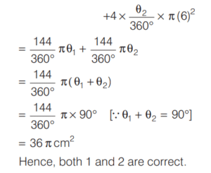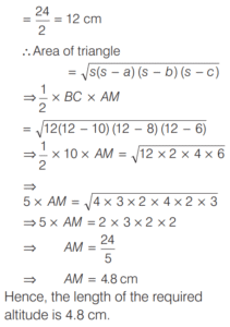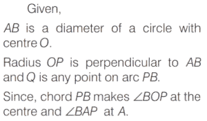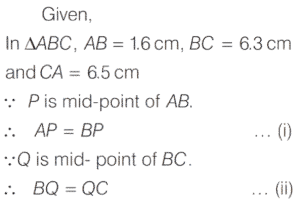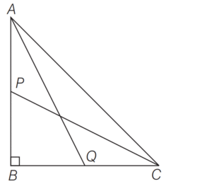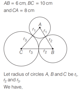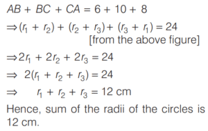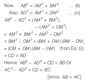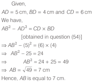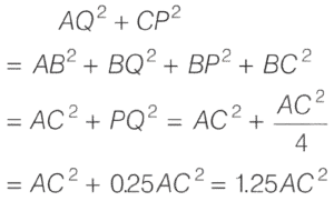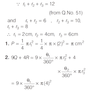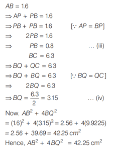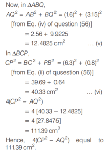 SOLVED PAPER 2021 (CDS) (II) (Elementary Mathematics)Total Questions: 10051. (Questions 51-53) Consider the following for the next three questions that follow.ABC is a triangle with sides AB = 6 cm, BC = 10 cm and CA = 8 cm. With vertices A B, and C as centres, three circles are drawn each touching the other two externally.What is the sum of the radii of the circles?(a) 10.4 cm(b) 11.2 cm(c) 12 cm(d) 13 cmCorrect Answer: (c) 12 cmSolution:In ∆ABC it is given that52. What is the length of the altitude of the triangle drawn from vertex A on BC ?(a) 2.4 cm(b) 3 cm(c) 4 cm(d) 4.8 cmCorrect Answer: (d) 4.8 cmSolution:In ∆ABC it is given that 53. If P, Q and R are the areas of sectors at A B, and C within the triangle respectively, then which of the following is/are correct1. P = π cm² 2. 9Q + 4R + = 36π cm²Select the correct answer using the code given below:(a) 1 only(b) 2 only(c) Both 1 and 2(d) Neither 1 nor 2Correct Answer: (c) Both 1 and 2Solution:54. (Questions 54 and 55) Consider the following next two questions that follow.ABC is triangle in which AB = AC and D is any point on BC.Which one of the following is correct?(a) AB²- AD² = AD × BD(b) AC²- AD² = BD × CD(c) AB²- AD² = 2 AD × BD(d) AC²- AD² = 2 BD × CDCorrect Answer: (b) AC²- AD² = BD × CDSolution:55. If AD = 5cm BD = 4cm and CD = 6 cm, then what is AB equal to ?(a) 7 cm(b) 6.5 cm(c) 6 cm(d) 5.5 cmCorrect Answer: (a) 7 cmSolution:56. (Questions 56-58) Consider the following for next three questions that follow.ABC is a triangle with AB = 1.6cm, BC = 6.3cm and CA = 6.5cm . Let P and Q be the mid-points of AB and BC respectively.What is AB² + 4 BQ² equal to ?(a) 41.25 cm²(b) 42.25 cm²(c) 43.75 cm²(d) 44.25 cm²Correct Answer: (b) 42.25 cm²Solution: 57. What is AQ² + CP² equal to?(a) AC²(b) 12 AC²(c) 1.25 AC²(d) 1.5 AC²Correct Answer: (c) 1.25 AC²Solution:58. What is 4(CP² - AQ²) equal to?(a) 101.39 cm²(b) 111.39 cm²(c) 121.39 cm²(d) 131.39 cm²Correct Answer: (b) 111.39 cm²Solution:59. (Questions 59 and 60) Consider the following for the next two questions that follows.AB is a diameter of a circle with centre O. Radius OP is perpendicular to AB. Let Q be any point on are PB.What is ∠BAP equal to ?(a) 30°(b) 40°(c) 45°(d) 60°Correct Answer: (c) 45°Solution:60. What is ∠AQP equal to?(a) 30°(b) 40°(c) 45°(d) 60°Correct Answer: (c) 45°Solution:Submit Quiz« Previous12345678910Next »