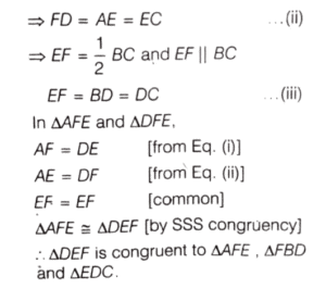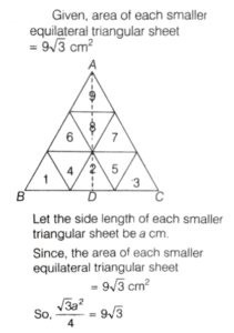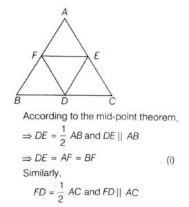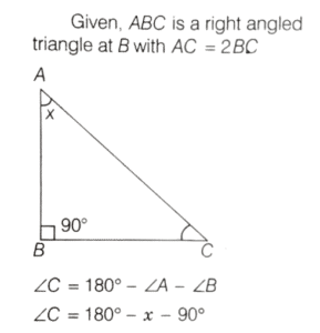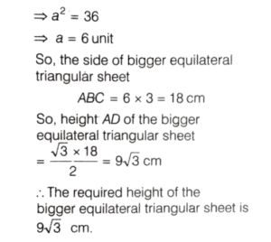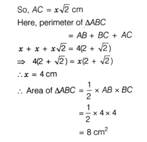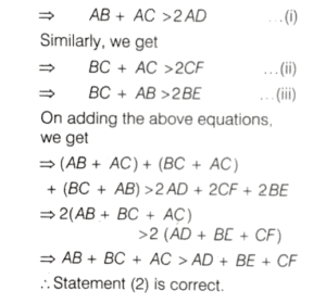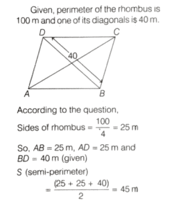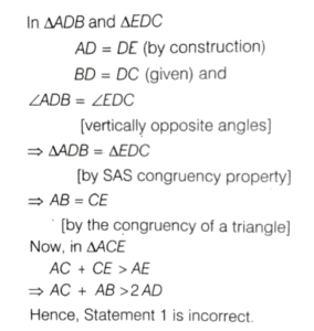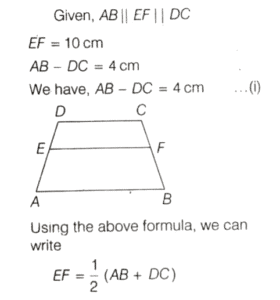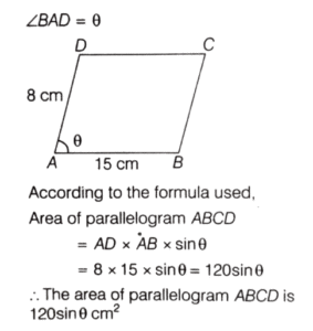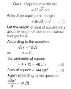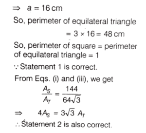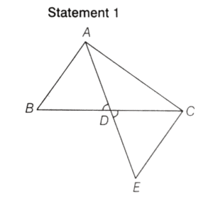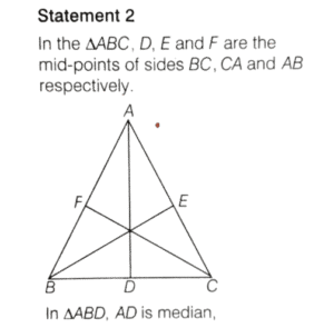 SOLVED PAPER 2022 (CDS) (I) (Elementary Mathematics)Total Questions: 10071. An equilateral triangular sheet is formed by joining 9 equilateral triangular sheets each of area 9√3 cm². What is the height of the bigger triangular sheet?(a) 9√3 cm(b) 18 cm(c) 18√3 cm(d) 27 cmCorrect Answer: (a) 9√3 cmSolution: 72. A farmland is in the shape of a rhombus. The perimeter of the land is 100 m and the length of one of the diagonals is 40 m. The land is divided into four equal parts. What is the area of each part?(a) 150m²(b) 225m²(c) 300m²(d) 450m²Correct Answer: (b) 225m²Solution: 73. ABCD is a trapezium in which AB is parallel to DC. Let E and F be the mid-points on AD and BC respectively. If EF = 10cm and AB - DC = 4cm then what is the value of AB × DC ?(a) 84 cm²(b) 96 cm²(c) 100 cm²(d) 108 cm²Correct Answer: (b) 96 cm²Solution: 74. ABCD is a parallelogram with AB = 15cm and AD = 8cm. If θ is the acute angle between AB and AD, then what is the area of the parallelogram (in sq cm) ?(a) 60sin θ(b) 120sin θ(c) 60cos θ(d) 120cos θCorrect Answer: (b) 120sin θSolution:Given ABCD is a parallelogram AB = 15 cm and AD = 8 cm75. If the perimeter of an isosceles right angled triangle is 4(2 + √2)cm, then what is its area in square cm?(a) 8(b) 12(c) 16(d) 24Correct Answer: (a) 8Solution: 76. The diagonal of a square is 12√2 cm and the area of an equilateral triangle is 64√3 square cm. Which of the following statements is/are correct?1. The square and the triangle have the same perimeter. 2. Four times the area of the square is equal to 3√3 times the area of the triangle.Select the correct answer using the code given below.(a) Only 1(b) Only 2(c) Both 1 and 2(d) Neither 1 nor 2Correct Answer: (c) Both 1 and 2Solution:77. Consider the following statements:1. The sum of any two sides of a triangle is less than twice the median drawn to the third side. 2. The perimeter of a triangle is greater than the sum of the three medians.Which of the above statements is/are correct?(a) Only 1(b) Only 2(c) Both 1 and 2(d) Neither 1 nor 2Correct Answer: (b) Only 2Solution: 78. Let D, E and F be the mid-points of the sides BC, CA and AB respectively of a triangle ABC. Triangle DEF is congruent to which of the following triangles?1. AEF 2. FBD 3. EDCSelect the correct answer using the code given below.(a) Only 1(b) Only 2 and 3(c) Only 3(d) 1, 2 and 3Correct Answer: (d) 1, 2 and 3Solution:Let D, E and F be the mid-points of the sides BC, CA and AB respectively of a tringle ABC. 79. In a triangle ABC, AB = AC and BC is produced to D such that ∠ACD = x, then what is ∠BAC equal to?(a) 2x - 90°(b) 2x - 180°(c) 180° - 2x(d) x/2Correct Answer: (b) 2x - 180°Solution:80. ABC is a triangle right angled at B with AC = 2BC If ∠A = x then what is ∠C equal to ?(a) x/2(b) 2x(c) √2x(d) √3xCorrect Answer: (b) 2xSolution: Submit Quiz« Previous12345678910Next »