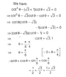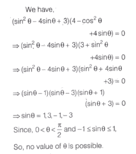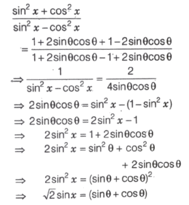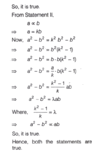 SOLVED PAPER 2023 (CDS) (II) (Elementary Mathematics)Total Questions: 10021. Consider the following statementsI. If (a + b) is directly proportional to (a - b) then (a² + b²) is directly proportional to ab. II. If a is directly proportional to b, then, (a² - b²) is directly proportional to ab.Which of the statements given above is/are correct?(a) Only I(b) Only II(c) Both I and II(d) Neither I nor IICorrect Answer: (c) Both I and IISolution: 22. If (3a + 6b + c + 2d) × (3a - 6b - c + 2d)= (3a - 6b + c - 2d) × (3a + 6b - c - 2d), then which one of the following is correct?(a) ab = cd(b) ac = bd(c) ad = bc(d) ad + bc = 0Correct Answer: (c) ad = bcSolution: 23. If 3sinθ + 5cosθ = 5, then what is the value of 5sinθ - 3cosθ equal to?(a) 5(b) -3(c) -2(d) 0Correct Answer: (b) -3Solution:24. The combined age of a man and his wife is 6 times the combined age of their children. 2 yr ago their combined age was 10 times the combined age of their children; and 6 yr later their combined age will be 3 times the combined age of their children. How many children do they have if each child is at least 2 yr old ?(a), 2(b) 3(c) 4(d) 5Correct Answer: (b) 3Solution: 25. What is 3 (sin x - cos x)⁴+ 6(sin x + cos x)² + 4 (sin x)⁶ + 4 (cos x)⁶ equal to?(a) 9(b) 11(c) 13(d) 15Correct Answer: (c) 13Solution: 26. What is the value of sinθ + cosθ if θ satisfies the equationcot² θ - (√3) + 1) cot θ + √3 = 0; 0 < θ < π ÷ 4 ?(a) √2(b) 2(c) (√3+1) ÷ 2(d) (√3-1) ÷ 2Correct Answer: (c) (√3+1) ÷ 2Solution:27. Which one of the following is a value of θ if θ satisfies the equation tan 2θ tan 4θ-1 = 0 ; 0 < θ < π÷2 ?(a) π ÷ 12(b) π ÷ 15(c) π ÷ 6(d) π ÷ 5Correct Answer: (a) π ÷ 12Solution:28. Solved(a)(b)(c)(d)Correct Answer: (a)Solution: 29. How many values of theta will satisfythe equation (sin² θ - 4sin θ + 3) (4 - cos² θ + 4sin θ) = 0, where 0 < θ < π÷2 ?(a) None(b) Only one(c) Only two(d) Only threeCorrect Answer: (a) NoneSolution:30. If x sin³ θ + y cos³ θ = sin θ cos θand x sin θ - y cos θ = 0 for every θ ∈ (0, π/2), then what is x² + y² equal to?(a) 0(b) 1(c) 2(d) 3Correct Answer: (b) 1Solution:Submit Quiz« Previous12345678910Next »