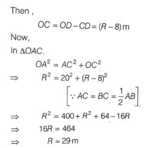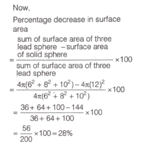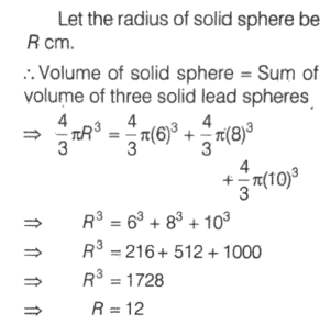 SOLVED PAPER 2023 (CDS) (II) (Elementary Mathematics)Total Questions: 10061. A pendulum swings through an angle of 9° and its end describes an arc of length 14.3 cm. What is the length of the pendulum? (take, π = 22/7)(a) 88 cm(b) 91 cm(c) 95 cm(d) 98 cmCorrect Answer: (b) 91 cmSolution:62. The arch of a bridge is in the form of an arc of a circle. If the span of the bridge is 40 m and height in the middle is 8 m, then what is the radius of curvature of the bridge?(a) 25 m(b) 27 m(c) 29 m(d) 31 mCorrect Answer: (c) 29 mSolution: 63. If a, b and c are the sides of a right-angled triangle, where a > b >c, then what is the value of the expression(a + b + c) (a + b - c) (a - b + c) (a - b - c) ?(a) 4b²c²(b) - 4b²c²(c) - 2a²b²(d) - 4a²b²Correct Answer: (b) - 4b²c²Solution:64. The cube root of x varies inversely as the square root of y. x = 8 when y = 3 What is the value of x when y = ³√3?(a) 18(b) 21(c) 24(d) 27Correct Answer: (c) 24Solution: 65. Three solid lead spheres of diameters 6 cm, 8 cm and 10 cm are melted together and recast as a solid sphere. What is the percentage diminution of the surface area as compared to the sum of the surface area of the three spheres ?(a) 25%(b) 26%(c) 27%(d) 28%Correct Answer: (d) 28%Solution: 66. A solid sphere of radius 3 cm is melted to form a hollow cylinder of height 4 cm and external diameter 10 cm. What is the thickness of the cylinder ?(a) 0.42 cm(b) 0:46 cm(c) 0.50 cm(d) 1.00 cmCorrect Answer: (d) 1.00 cmSolution: 67. Three glasses P, Q and R have capacities in the ratio 1 : 2 : 3. All these glasses are completely filled with mixtures of milk and water. The ratio of milk to water in P is 1 : 2, in Q it is 2 : 3 and in R it is 3 : 1. If the content of all three glasses are put into a bigger container, what will be the ratio of milk to water in the container ?(a) 203 : 117(b) 203 : 157(c) 172 : 91(d) 165 : 88Correct Answer: (b) 203 : 157Solution:68. Solved(a)(b)(c)(d)Correct Answer: (c)Solution:69. Solved(a)(b)(c)(d)Correct Answer: (c)Solution:70. If tan A + cot A = 2 where0 < A < 90° then what is the value of tan² A + tan³ A +tan⁴ A +.......+ tanⁿ A ?(a) 1(b) n - 2(c) n - 1(d) nCorrect Answer: (c) n - 1Solution:Submit Quiz« Previous12345678910Next »
