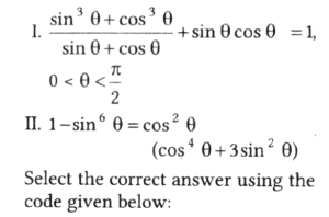SOLVED PAPER 2023 (CDS) (II) (Elementary Mathematics)Total Questions: 10071. Which of the following is/are identity/identities?(a) Only I(b) Only II(c) Both I and II(d) Neither I nor IICorrect Answer: (c) Both I and IISolution: 72. If 7sin⁴ θ + 9cos⁴ θ +42 sin² θ = 16, 0 < θ < π/2, then what is tan θ equal to?(a) 1(b) √2(c) √3(d) 1/√3Correct Answer: (d) 1/√3Solution: 73. An isosceles triangle has its base length 2a and its height is h. On each side of the triangle a square is drawn external to the triangle. What is the area of the figure thus formed?(a)(b)(c)(d)Correct Answer: (b)Solution: 74. Solved(a) 9(b) 4(c) 1(d) 0Correct Answer: (c) 1Solution: 75. Which one of the following is a factor ofa² - b² - c² + 2bc + a + b - c ?(a) a + b + c + 1(b) a - b - c + 1(c) a + b + c - 1(d) a - b + c + 1Correct Answer: (d) a - b + c + 1Solution:76. Solved(a)(b)(c)(d)Correct Answer: (b)Solution: 77. Solved(a) 0(b) 1(c) 1.8(d) 20Correct Answer: (d) 20Solution: 78. A train completely overtakes two persons, walking in the same direction with speeds 3 km/h and 4 km/h in 9 sec and 75/8 sec, respectively. What is the length of the train?(a) 60 m(b) 62.5 m(c) 55 m(d) 67.5 mCorrect Answer: (b) 62.5 mSolution: 79. A person bought an article and sold it at a profit of 20%. Had he bought it at 20% less, what would have been the profit percentage if the selling price had been the same?(a) 25%(b) 40%(c) 50%(d) 60%Correct Answer: (c) 50%Solution:80. If 2s = a + b + c then what iss² + (s - a) (s - b) + (s - b) (s - c) (s - c) (s - a) equal to?(a) (a + b + c)²(b) ab + bc + ca(c) 2(ab + bc + ca)(d) 3(ab + bc + ca)Correct Answer: (b) ab + bc + caSolution:Submit Quiz« Previous12345678910Next »