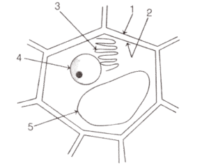Solution:In the given diagram, 1 is cell wall, 2 is cell membrane, 3 is endoplasmic reticulum, 4 is nucleus and 5 is vacuole. In plant cell, cell wall provides protection shape and support to the plant. The plant cell wall is mainly made up of the carbohydrates molecules such as cellulose and lignin. The cell wall surrounds the most adult plant cells, have large vacuole that takes up more than 70% of the cell's volume. The liquid inside the vacuole exerts an outward pressure on the cell. In plant cell, endoplasmic reticulum is located between cell membrane and nuclear membrane. It forms cytoskeleton by spreading in entire cytoplasm. A round nucleus is found in plant cell. The main function of nucleus is control of cell division, cell growth and production of ribosomes. It contains nucleolus and double nuclear membrane.