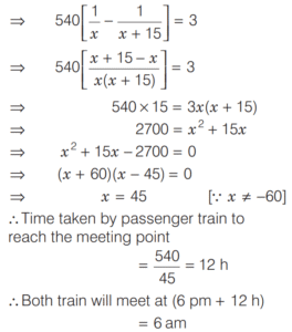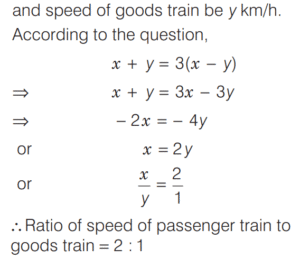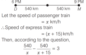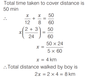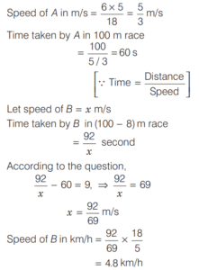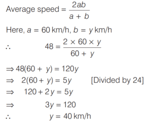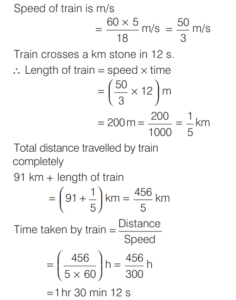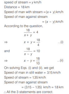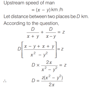 SPEED, TIME AND DISTANCE (CDS)Total Questions: 5411. A passenger train and a goods train are running in the same direction on parallel railway tracks. If the passenger train now takes three times as long to pass the goods train, as when they are running in opposite directions, then what is the ratio of the speed of the passenger train to that of the goods train? (Assume that the trains run at uniform speeds) [2018 (I) Morning Shift](a) 2 : 1(b) 3 : 2(c) 4 : 3(d) 1 : 1Correct Answer: (a) 2 : 1Solution:Let the speed of passenger train be x km/h,12. A man can row at a speed of x km/h in still water. If in a stream which is flowing at a speed of y km/h it takes him z h to row to a place and back, then what is the distance between the two places? [2018 (I) Morning Shift](a)(b)(c)(d)Correct Answer: (b)Solution:Downstream speed of man = (x + y) km/h13. A car has an average speed of 60 km/h while going from Delhi to Agra and has an average speed of y km/h while returning to Delhi from Agra (by travelling the same distance). If the average speed of the car for the whole journey is 48 km/h, then what is the value of y? [2018 (I) Morning Shift](a) 30 km/h(b) 35 km/h(c) 40 km/h(d) 45 km/hCorrect Answer: (c) 40 km/hSolution:We know that, if a car travels a distance at ‘a’ km/h and returns at ‘b’ km/h, then14. If a train crosses a km-stone in 12 s, how long will it take to cross 91 km-stones completely if its speed is 60 km/h? [2017 (II) Evening Shift ](a) 1 h 30 min(b) 1 h 30 min 12 s(c) 1 h 51 min(d) 1 h 1 min 3 sCorrect Answer: (b) 1 h 30 min 12 sSolution:We have, speed of train = 60 km/h15. In a 100 m race, A runs at 6 km/h. If A gives B a start of 8m and still beats him by 9 s, what is the speed of B ? [2017 (II) Evening Shift ](a) 4.6 km/h(b) 4.8 km/h(c) 5.2 km/h(d) 5.4 km/hCorrect Answer: (b) 4.8 km/hSolution:Speed of A = 6 km/h16. A boy went to his school at a speed of 12 km/h and returned to his house at a speed of 8 km/h. If he has taken 50 min for the whole journey, what was the total distance walked ? [2017 (II) Evening Shift ](a) 4 km(b) 8 km(c) 16 km(d) 20 kmCorrect Answer: (b) 8 kmSolution:Let the distance between school to house is x km.17. A man rows down a river 18 km in 4 h with the stream and returns in 10 h. [2017 (II) Evening Shift ]Consider the following statement 1. The speed of the man against the stream is 1.8 km/h. 2. The speed of the man in still water is 3.15 km/h. 3. The speed of the stream is 1.35 km/h.Which of the above statements are correct?(a) 1 and 2(b) 2 and 3(c) 1 and 3(d) 1, 2 and 3Correct Answer: (d) 1, 2 and 3Solution:Let the speed of man in still water = x km/h18. A man travelled 12 km at a speed of 4 km/h and further 10 km at a speed of 5 km/h. What was his average speed ? [2017 (II) Evening Shift ](a) 4.4 km/h(b) 4.5 km/h(c) 5.0 km/h(d) 2.5 km/hCorrect Answer: (a) 4.4 km/hSolution:19. In a 100 m race A runs at a speed of 5/3 m/s. If A give a start of 4 m to B and still beats him by 12 s, what is speed of B [2017 (I) Morning Shift ](a)(b)(c)(d)Correct Answer: (c)Solution:Let the speed of B be x m/s.20. A passenger train departs from Delhi at 6 pm for Mumbai. At 9 pm an express train, whose average speed exceeds that of the passenger train by 15 km/h leaves Mumbai for Delhi. Two trains meet each other mid-route. At what time do they meet, given that the distance between the cities is 1080 km? [2017 (I) Morning Shift ](a) 4 pm(b) 2 am(c) 12 mid-night(d) 6 amCorrect Answer: (d) 6 amSolution:Submit Quiz« Previous123456Next »
