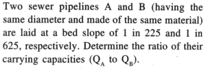 SSC-JUNIOR ENGINEER (Civil & Structural) Online Exam 2020 (Exam held on 23/03/2021) (Part-IV)GENERAL ENGINEERING CIVIL AND STRUCTURALTotal Questions: 5021. On a right angle two-lane road intersection with two-way traffic, the total number of potential conflict points are:A. 24B. 44C. 18D. 32Correct Answer: A. 24Solution:Number of possible conflict points at any intersection depends on the number of approaches, turning movements and type of traffic control at the intersection.22. Select the INCORRECT obstacle in chaining in a chain survey.A. Obstacle to both chaining and rangingB. Obstacle to plottingC. Obstacle to ranging onlyD. Obstacle to chaining onlyCorrect Answer: B. Obstacle to plottingSolution:Obstacles to plotting or levelling is not a kind of obstacles to chaining. Obstacles of chaining are of three kinds. They are obstacles to ranging, obstacles to chaining, obstacles to both chaining and ranging.23. A construction firm has estimated a net annual rent of ₹90,000 on a building, at the prevailing annual rate of interest of 9%. If the annual interest rate is revised to 5%, determine the increase in the capitalized value of the property.A. ₹ 10,00,000B. ₹ 18,00,000C. ₹ 8,00,000D. ₹ 22,50,000Correct Answer: C. ₹ 8,00,000Solution:24. Among the following corrections applied for tape measurement, identify the correction which is NOT always negative in sign.A. Slope of tapeB. PullC. SagD. Wrong alignmentCorrect Answer: B. PullSolution:Pull Correction (Cₚ): During measurement, the applied pull may be either more or less than the pull at which the chain or tape was standardised. Due to the elastic property of materials, the strain will vary according to the variation of applied pull, and hence necessary correction should be applied. This correction is given by the expressionThe sign of correction will be positive or negative according as Pₘ is greater or less than Pₒ.25. Among the following river training works, which are aligned either parallel or at an angle to the banks, identify the one having a difference in alignment when compared to others.A. Guide banksB. LeveesC. GroynesD. Flood wallsCorrect Answer: C. GroynesSolution:Groynes or spurs:Structures constructed transverse to the river flow extending from the bank into the river.Can be aligned either perpendicular to the bank or at an angle pointing d/s or u/s.Also known as spur dike or transverse dikes and constitute the most widely used river training works.Nose of the groyne is subjected to a tremendous action of water and has to be heavily protected by pitching.26. As per IRC (Indian Roads Congress) recomm-endation, what will be the designed stopping sight distance (in metres) at the vehicle speed of 80 km/h on a rural highway?A. 70B. 60C. 120D. 140Correct Answer: C. 120Solution:Recommended value of stopping sight distance as per IRCDesign speed (km/h)Safe stopping distance (m)5060 m6080 m6590 m80120 m27. The liquid limit and plastic limit of clay materials is 45% and 25% respectively, what is the activity of clay materials if 20% by weight of particles of size less than 2 microns?A. 3B. 0C. 2D. 1Correct Answer: D. 1Solution:No explanation given in the book28. Which of the following CANNOT be considered as a hard surface lining of canal?A. Boulder liningB. Asphaltic concrete liningC. Plaster lining.D. Soil cement liningCorrect Answer: D. Soil cement liningSolution:Canal linings are classified into two major types based on the nature of surface and they are:1. Earthen type lining 2. Hard surface liningEarthen Type linings are again classified into two types and they are as follows:Compacted Earth LiningSoil Cement LiningSoil Cement Lining: Soil-cement linings are constructed with mixtures of sandy soil, cement and water, which harden to a concrete-like material.Hard Surface Canal Linings: It is sub divided into 4 types and they are:Cement Concrete LiningBrick LiningPlastic LiningBoulder Lining29. Select the correct statement with respect to a slow sand filter.A. The rate of filtration is in the range of 100-150 m³ / m²/day.B. The filtering medium has effective size 0.45 to 0.7 mm, uniformity coefficient 1.3 to 1.7, multiple graded layers of sand with bacteria and odour removal.C. The effective size of sand particles shall be 0.15 to 0.3 mm, and their uniformity coefficient shall be preferably below 3.D. Backwashing daily or on alternate days is necessary for cleaning.Correct Answer: C. The effective size of sand particles shall be 0.15 to 0.3 mm, and their uniformity coefficient shall be preferably below 3.Solution:Slow sand filter: They consist of fine sand, supported by gravel. They capture particles near the surface of the bed and are usually cleaned by scraping away the top layer of sand that contains the particles.In SSF the effective size ranges between 0.2 to 0.4 mm and uniformity coefficient between 1.8 to 2.5 or 3.0. In RSF the effective size ranges between 0.35 to 0.55 and uniformity coefficient between 1.2 to 1.8.30. Solve the question.A. 1B. 3/5C. 2/5D. 5/3Correct Answer: D. 5/3Solution:Submit Quiz« Previous12345Next »