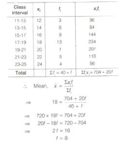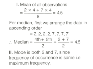 STATISTICS (CDS)Total Questions: 6361. Consider the following in respect of variate which takes values 2, 2, 2, 2, 7, 7, 7 and 7.I. The median is equal to mean. II. The mode is both 2 and 7.Which of the above statement(s) is/are correct?(a) Only I(b) Only II(c) Both I and II(d) Neither I nor IICorrect Answer: (c) Both I and IISolution:62. Consider the following statements pertaining to a frequency polygon of a frequency distribution of a continuous variable having seven class intervals of equal width.I. The original frequency distribution can be reconstructed from the frequency polygon. II. The frequency polygon touches the X-axis in its extreme right and extreme left.Which of the above statement(s) is/are correct?(a) Only I(b) Only II(c) Both I and II(d) Neither I nor IICorrect Answer: (a) Only ISolution:Frequency polygon is formed by joining the mid-points of histogram. Original frequency distribution can be reconstructed from frequency polygon. Frequency polygon does not touch the X-axis in its extreme right and extreme left.63. The mean of the following: distribution is 18.(a) 8(b) 9(c) 10(d) 11Correct Answer: (a) 8Solution:Submit Quiz« Previous1234567
