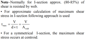 Strength of Material (Part-3) (General Engineering) (SSC JE)Total Questions: 5041. Curve having ordinate of some particular function due to unit load acting at that point is known as [JSSC JE (GEN. ENGG)-2017 ](a) influence line(b) random line(c) curve line(d) redundant lineCorrect Answer: (a) influence lineSolution:Influence lines–An influence line is a curve, the ordinates to which at any point equals the value of same particular function due to unit load acting at that point.42. According to maximum shear stress criterion, yielding in material occurs when [BPSC AE (GEN. ENGG.) 16.09.2018 ](a) maximum shear stress = 2 yield stress(b) maximum shear stress = 0.5 yield stress(c) maximum shear stress = √2 yield stress(d) maximum shear stress = √(2/3) yeilds stressCorrect Answer: (b) maximum shear stress = 0.5 yield stressSolution:43. For a symmetrical I section, the maximum shear stress occurs at: [JSSC JE (GEN. ENGG.)- 31.10.2022 ](a) extreme ends(b) flange(c) centroid(d) webCorrect Answer: (c) centroidSolution: 44. If a material has identical properties in all directions, it is said to be– [RRB JE 26.08.2015 (Shift-I) / RRB S.S.E. 02.09.2015 (Shift-II) / RRB S.S.E. 02.09.2015 (Shift-III) ](a) Homogenous(b) Isotropic(c) Elastic(d) OrthotropicCorrect Answer: (b) IsotropicSolution:Isotropic–A material's properties are the same in all direction. eg:- Metals and glass Anisotropic–A material's properties are affected by its orientation. eg:- Wood45. Bending compressive and tensile stresses respectively are calculated based on [RRB JE 26.08.2015 (Shift-II) ](a) Net area and gross area(b) Gross area and net area(c) Net area in both cas(d) Gross area in both casesCorrect Answer: (b) Gross area and net areaSolution:46. If the modulus of elasticity is zero, the material is said to be– [RRB JE 26.08.2015 (Shift-II) ](a) Rigid(b) Elastic(c) Flexible(d) PlasticCorrect Answer: (d) PlasticSolution:If the modulus of elasticity is zero (E = 0) then slope of the stress-strain curve is straight line. • It means at constant stress-strain keeps increasing which is the characteristic property of perfectly plastic material. 47. The unit of elastic modulus is the same as those of [RRB JE 27.08.2015 (Shift-I) ](a) Stress, shear modulus and pressure(b) Strain, shear modulus and force(c) Shear modulus, stress and force(d) Stress, strain and pressureCorrect Answer: (a) Stress, shear modulus and pressureSolution:48. The point where the bending moment is zero is called as [RRB S.S.E. (Secunderabad) 02.09.2015 (Shift-I) / APPSC AE PRE.-15.05.2022 ](a) Point of contraflexure(b) Yield point(c) Plastic hinge(d) Limit of elasticityCorrect Answer: (a) Point of contraflexureSolution:The point where the bending moment is zero is called as point of contraflexure. e.g 49. Cup and cone type fracture occurs in the case of- [RRB JE 28.08.2015 (Shift-III) ](a) Cast iron(b) Round specimen of ductile metals(c) Tough steel(d) Soft brassCorrect Answer: (b) Round specimen of ductile metalsSolution:• Cup and cone type of fracture occurs in the case of round specimen of ductile metals. • Failure plane is at 45º. Shear strength < Tensile strength < Compressive strength.50. A prismatic beam has uniform : [RRB JE 28.08.2015 (Shift-II) ](a) Depth(b) Width(c) Strength(d) Cross–sectionCorrect Answer: (d) Cross–sectionSolution:A prismatic beam is a structural element that has a uniform cross-section along its length.Submit Quiz« Previous12345