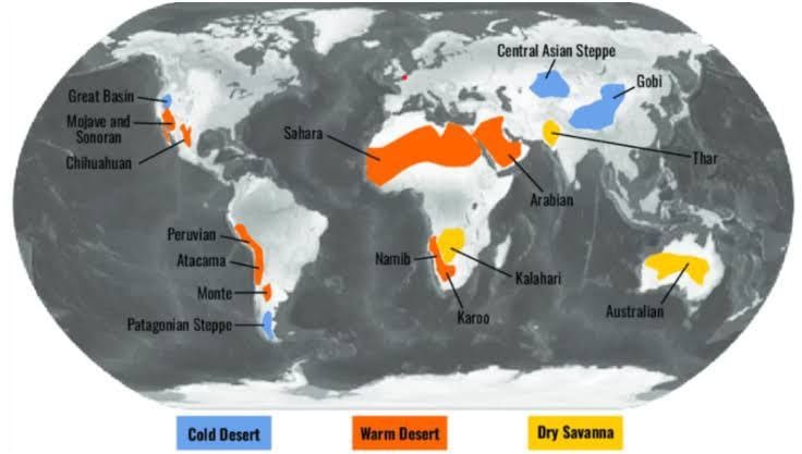 Solution:The extension of hot dry desert climate on the earth is found between 15-30º latitudes. There are four major geographical conditions for the formation of desert on the earth: