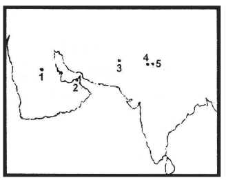8. The given map shows locations of airports labelled as 1, 2, 3, 4 and 5. What is the correct sequences of the airports in which the hijacked Indian Airlines plane IC-814 landed after its initial take off from Kathmandu in December 1999? [I.A.S. (Pre) 2000]