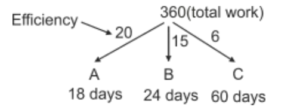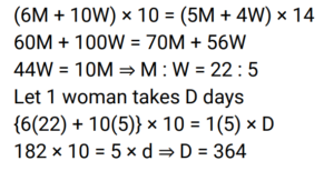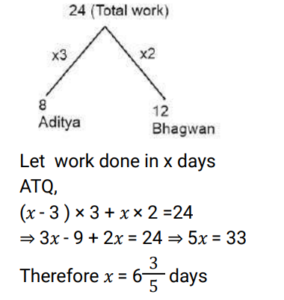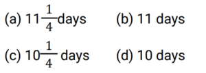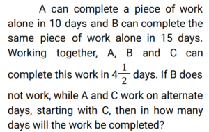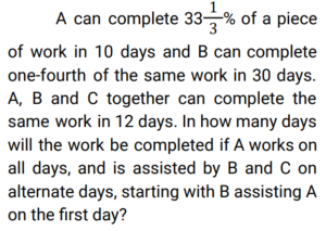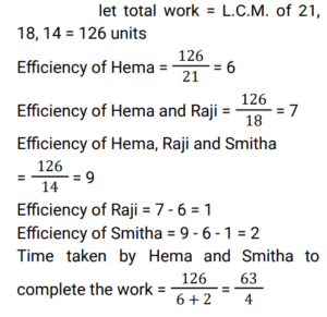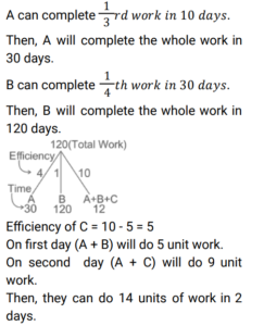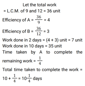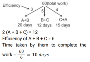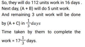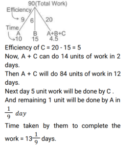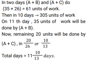 Time and Work (Railway Maths) (Part – II)Total Questions: 5011. A and B can complete a piece of work in 20 days, B and C can complete the same piece of work in 12 days, while C and A can do it in 15 days. In how many days can A, B, and C together complete the same work? [Group D 22/09/2022 (Evening)](a) 15(b) 5(c) 10(d) 12Correct Answer: (c) 10Solution:12. A, B and C can complete a piece of work in 18 days, 24 days and 60 days, respectively. In how many days will the work be completed, if A works on all days, and is assisted by B and C on alternate days, starting with B assisting A on the first day? [Group D 26/09/2022 (Morning) ](a)(b)(c)(d)Correct Answer: (d)Solution:13. Find the answer of given question? [Group D 26/09/2022 (Evening) ](a)(b)(c)(d)Correct Answer: (a)Solution:14. Find the answer of given question? [Group D 26/09/2022 (Evening) ](a)(b)(c)(d)Correct Answer: (b)Solution:15. Aditya can complete a piece of work alone in 8 days and Bhagawan can complete the same piece of work alone in 12 days. They started the work together, but Aditya had to leave 3 days before the completion of the work. In how many days will the work complete? [Group D 27/09/2022 (Morning) ](a)(b)(c)(d)Correct Answer: (a)Solution:16. Hema can do a certain piece of work in 21 days. Hema and Raji can together do the same work in 18 days, and Hema, Raji, and Smitha can do the same work together in 14 days. In how many days can Hema and Smitha do the same work, working together? [Group D 29/09/2022 (Evening)](a) 63/5(b) 63/4(c) 63(d) 36/5Correct Answer: (b) 63/4Solution:17. X people were given a contract for doing a piece of work in 15 days. 3 people did not turn up to work due to sickness, and the rest of the people completed the work in 20 days. What is the value of X? [Group D 30/09/2022 (Morning)](a) 12(b) 14(c) 15(d) 10Correct Answer: (a) 12Solution:18. 6 men and 10 women complete a work in 10 days. 5 men and 4 women complete the same work in 14 days. How many days will it take for 1 woman to complete the same work? [Group D 30/09/2022 (Afternoon)](a) 364(b) 390(c) 280(d) 350Correct Answer: (a) 364Solution:19. A and B can do a piece of work in 9 days and 12 days, respectively. A starts the work and they work on alternate days. They can finish the work in: [Group D 06/10/2022 (Morning) ](a)(b)(c)(d)Correct Answer: (c)Solution:20. A and B together can complete a piece of work in 5 days. They started working together but after 3 days, B left. If the work is completed after 3 more days, B alone could do the entire work in: [Group D 07/10/2022 (Afternoon) ](a) 7.5 days(b) 15 days(c) 6.5 days(d) 13 daysCorrect Answer: (b) 15 daysSolution:Submit Quiz« Previous12345Next »