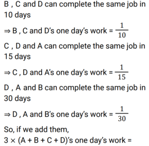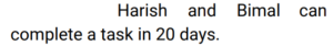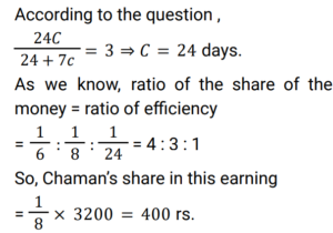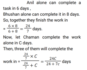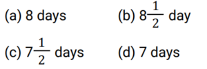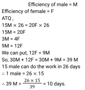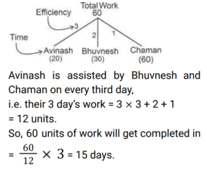 Time and Work (Railway Maths) (Part – III)Total Questions: 501. The capacity of working by A and B is in the ratio 3 : 4. If A takes 12 days to finish the work, the time taken by B to finish the same work is: [RRB NTPC 28/12/2020 (Evening)](a) 9 days(b) 16 days(c) 18 days(d) 12 daysCorrect Answer: (a) 9 daysSolution:2. A, B and C can complete a job in 5 days. B, C, and D can complete the same job in 10 days. C, D, and A can complete the same job in 15 days and D, A, and B can complete the same job in 30 days. How long do A, B, C, and D together take to finish the job? [RRB NTPC 29/12/2020 (Morning)](a)(b)(c)(d)Correct Answer: (c)Solution:3. Avinash, Bhuvnesh, and Chaman can complete a piece of work in 20, 30, and 60 days respectively. In how many days can Avinash complete the work if he is assisted by Bhuvnesh and Chaman on every third day? [RRB NTPC 30/12/2020 (Morning)](a) 16(b) 18(c) 15(d) 12Correct Answer: (c) 15Solution:4. A and B can complete a job in 40 days and 60 days respectively. They work together for some days and B leaves the job. If A completes the rest of the work in 10 days, find for how many days B worked? [RRB NTPC 30/12/2020 (Evening)](a) 15 days(b) 14 days(c) 18 days(d) 16 daysCorrect Answer: (c) 18 daysSolution:5. 15 male employees or 20 female employees of a company can complete a project in 26 days. How long will 30 male employees and 12 female employees together take to complete the project? [RRB NTPC 04/01/2021 (Morning)](a) 14 days(b) 10 days(c) 12 days(d) 8 daysCorrect Answer: (b) 10 daysSolution:6. Harish and Bimal can complete a task in 20 days. They worked at it for 15 days and then Bimal left. The remaining work was done by Harish alone in 10 days. Harish alone can complete the entire task in: [RRB NTPC 04/01/2021 (Morning)](a) 40 days(b) 45 days(c) 35 days(d) 30 daysCorrect Answer: (a) 40 daysSolution:7. Anil alone can complete a task in 6 days and Bhushan alone can complete it in 8 days. Anil and Bhushan undertook the task for Rs.3,200. With the help of Chaman, they completed the task in 3 days. What is Chaman’s share in this earning? [RRB NTPC 05/01/2021 (Morning)](a) Rs.375(b) Rs.600(c) Rs.400(d) Rs.800Correct Answer: (c) Rs.400Solution:8. Anil and Balbeer can finish a task in 3 days. They started working together, but after 2 days Anil got injured. Balbeer took 2 more days to finish the task. In how many days can Balbeer alone finish the same task? [RRB NTPC 05/01/2021 (Morning)](a) 10(b) 9(c) 5(d) 6Correct Answer: (d) 6Solution:9. Amar Jeet Singh can complete a piece of work in 5 days. With the help of his son he can complete it in 3 days. In how many days can the son independently complete the work ? [RRB NTPC 05/01/2021 (Evening) ](a)(b)(c)(d)Correct Answer: (b)Solution:10. 35 people could complete a work in 24 days. But after they worked together for 6 days, their employer wanted that the work should be completed in a total of 16 days. How many more workers need to be employed to meet the deadline ? [RRB NTPC 05/01/2021 (Evening) ](a) 24(b) 28(c) 20(d) 32Correct Answer: (b) 28Solution:Submit Quiz12345Next »
