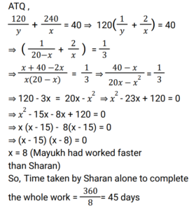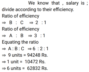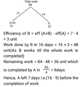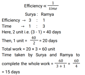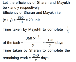 Time and Work (Railway Maths) (Part – V)Total Questions: 5741. L does thrice as much work as M, and together they complete a piece of work in 12 days. In how many days L alone can complete the same work? [ALP Tier II 23/01/2019 (Afternoon) ](a) 48(b) 16(c) 40(d) 32Correct Answer: (b) 16Solution:42. B is twice as efficient as C and A is thrice efficient as B. If they are paid with a salary of Rs. 94,842 together, what is the salary received by A? [RPF Constable 18/01/2019 (Morning)](a) Rs. 63,822(b) Rs. 63,825(c) Rs. 63,282(d) Rs. 63,228Correct Answer: (d) Rs. 63,228Solution:43. B is twice as efficient as C and A is thrice as efficient as B. If both of them are paid a salary of Rs. 94,248, then how much is the wage to be received by A? [RPF Constable 19/01/2019 (Morning)](a) Rs. 62,286(b) Rs. 62,832(c) Rs. 65,268(d) Rs. 65,682Correct Answer: (b) Rs. 62,832Solution:44. Sharan and Mayukh, working together, can complete a task in 18 days. However, Mayukh works alone and leaves after completing one-third of the task. Then, Sharan takes over and completes the remaining work by himself. As a result, the duo could complete the task in 40 days. How many days would Sharan alone have taken to do the job if Mayukh had worked faster than Sharan? [RRB ALP 09/08/2018 (Afternoon)](a) 30(b) 45(c) 24(d) 72Correct Answer: (b) 45Solution:45. In a computer game, a builder can build a wall in ten hours while a destroyer can demolish such a wall completely in fourteen hours. Both, the builder and the destroyer were initially set to work together on level ground. But after 7 hours the destroyer was taken out. What was the total time (in hours) taken to build the wall? [RRB ALP 09/08/2018 (Afternoon) ](a) 35(b) 24(c) 17(d) 15Correct Answer: (d) 15Solution:46. Surya works 3 times as fast as Ramya and is able to complete a work in 40 days less than the number of days taken by Ramya. Find the time in which they can complete the work together. [RRB ALP 10/08/2018 (Afternoon) ](a) 20 days(b) 30 days(c) 25 days(d) 15 daysCorrect Answer: (d) 15 daysSolution:47. A and B can complete a task in 12 days. However, A had to leave a few days before the task was completed and hence it took 16 days in all to complete the task. If A alone could complete the work in 21 days, how many days before the work getting over did A leave? [RRB ALP 10/08/2018 (Afternoon) ](a) 7(b) 9(c) 5(d) 3Correct Answer: (a) 7Solution:48. A and B together can complete a task in 12 days. However, if A works alone, completes half the job and leaves and then B works alone and completes the rest of the work, it takes 25 days in all to complete the work. If B is more efficient than A, how many days would it have taken B to do the work by herself? [RRB ALP 13/08/2018 (Morning) ](a) 22(b) 20(c) 18(d) 15Correct Answer: (b) 20Solution:49. Thirty men can do a piece of work in 16 days working 8 hrs a day. How many men are needed to complete another work, which is twice the first one, in 10 days working 12 hrs a day? The following are the steps involved in solving the above problem. Arrange them in sequential order. [RRB ALP 14/08/2018 (Morning) ](a) BACD(b) ABCD(c) CBAD(d) ACBDCorrect Answer: (c) CBADSolution:50. A piece of work can be done by 16 men in 8 days working 12 hours a day. How many men are needed to complete another work, which is three times the first one, in 24 days working 8 hours a day? [RRB ALP 17/08/2018 (Morning) ](a) 23 men(b) 22 men(c) 25 men(d) 24 menCorrect Answer: (d) 24 menSolution:Submit Quiz« Previous123456Next »