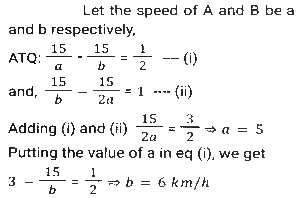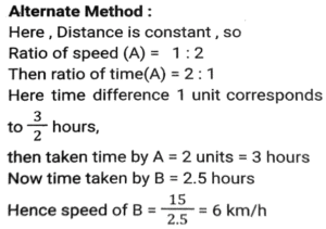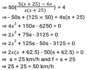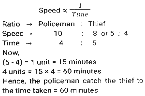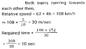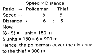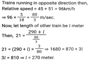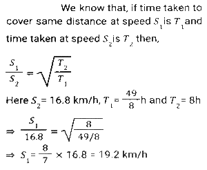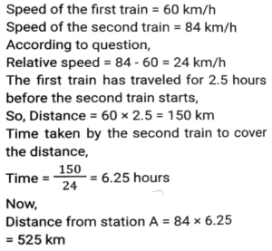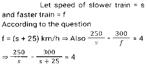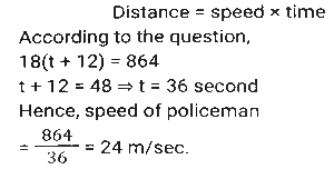 Time, Speed and Distance (Part-2)Total Questions: 501. The speed of train A is 25 km/h more than the speed of train B. A takes 4 hours less time to travel a distance of 300 km than what train B takes to travel 250 km. What is the speed (In km/h) of A? [SSC CGL 10/06/2019 (Morning)](a) 60(b) 50(c) 65(d) 55Correct Answer: (b) 50Solution:2. A and B are travelling towards each other from the points P and Q respectively. After crossing each other A and B take 6⅛ hours and 8 hours, respectively, to reach their destinations Q and P, respectively. If the speed of B is 16.8 km/h then the speed (in km/h) of A is: [SSC CGL 06/06/2019 (Morning)](a) 20.8(b) 19.8(c) 19.2(d) 20.4Correct Answer: (c) 19.2Solution:3. A takes 30 minutes more than B to cover a distance of 15 km at a certain speed. But if A doubles his speed, he takes one hour less than B to cover the same distance. What is the speed (in km/h) of B? [SSC CGL 04/06/2019 (Afternoon)](a)(b)(c)(d)Correct Answer: (a)Solution:4. The speed of a car increases by 2 km/h after every one hour. If the distance travelled in the first one hour was 35 km, what was the total distance travelled in 12 hours? [SSC CPO 16/03/2019 (Evening)](a) 560(b) 650(c) 558(d) 552Correct Answer: (d) 552Solution:5. A thief saw a policeman, and he started running at a speed of 18 m/s. After 12 seconds, the policeman starts running behind the thief at a certain speed. If the policeman covered 864 meters distance to reach the thief. then the speed (in m/s) of the policeman is: [SSC MTS 30/09/2024 (Morning)](a) 28(b) 15(c) 30(d) 24Correct Answer: (d) 24Solution:6. Two trains, 148 m and 152 m long, are running towards each other on parallel lines at 62 km/h and 46km/h, respectively. In what time will they be clear of each other from the moment they meet? [SSC MTS 30/09/2024 (Morning)](a) 5 sec(b) 20 sec(c) 10 sec(d) 15 secCorrect Answer: (c) 10 secSolution:7. A policeman follows a thief, who is 150 metres ahead of him., and they run at the speed of 6 km/h and 5 km/h, respectively. What distance does the policeman cover to catch up with the thief? [SSC MTS 30/09/2024 (Afternoon)](a) 880 metres(b) 870 metres(c) 890 metres(d) 900 metresCorrect Answer: (d) 900 metresSolution:8. A Policeman chases a thief. The speed of the policeman and thief are 10 kmph and 8 kmph, respectively. If the policeman started 15 minutes late, find the time taken by the policeman to catch the thief. [SSC MTS 30/09/2024 (Afternoon)](a) 15 minutes(b) 45 minutes(c) 30 minutes(d) 60 minutesCorrect Answer: (d) 60 minutesSolution:9. Two trains running towards each other on parallel tracks, at speeds of 45 km/hr and 51 km/hr, take 21 seconds to cross each other. If the length of one train is 290 m, then the length (in m) of the other train is: [SSC MTS 01/10/2024 (Morning)](a) 250(b) 290(c) 230(d) 270Correct Answer: (d) 270Solution:10. A train travelling at a speed of 60 km/h leaves station A at 7:00 a.m. and another train travelling at a speed of 84 km/h starts from station A at 9:30 a.m. in the same direction on a parallel track. At what distance (in km) from station A and after how many hours of travel of the second train will they be together ? Express your answer in the same order. [SSC MTS 01/10/2024 (Afternoon)](a) 693, 8.25(b) 525, 6.25(c) 375, 6.25(d) 495, 8.25Correct Answer: (b) 525, 6.25Solution:Submit Quiz12345Next »