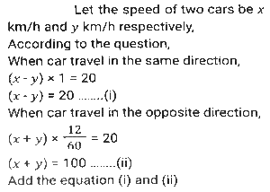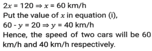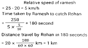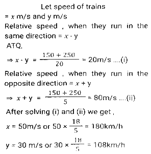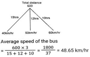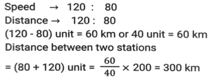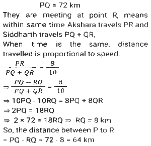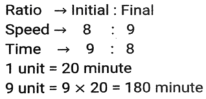 Time, Speed and Distance (Part-2)Total Questions: 5021. Two trains start at the same time from two stations and proceed towards each other at speeds of 120 km/hr and 80 km/hr, respectively. When they meet, it is found that one train has travelled 60 km more than the other. What is the distance (in km) between the two stations? [SSC MTS 12/11/2024 (Evening)](a) 387(b) 300(c) 268(d) 452Correct Answer: (b) 300Solution:22. A thief Rohan is spotted by a policeman Ramesh from a distance of 250 m. When they see each other, they start running. How much distance is covered by Rohan, who is running at the speed of 20 km/h, before being caught by Ramesh, who is running at the speed of 25 km/h? [SSC MTS 13/11/2024 (Afternoon)](a) 2 km(b) 3 km(c) 1 km(d) 4 kmCorrect Answer: (c) 1 kmSolution:23. A man covers 30 km by car at a speed of 60 km/h and another 20 km by cycle. His whole journey is completed in 3 hours. What is the speed (in km/h) of the cycle? [SSC MTS 13/11/2024 (Evening)](a) 10(b) 12(c) 8(d) 6Correct Answer: (c) 8Solution:24. A person can complete a journey in 21 hours. He covers the first one-third of the journey at the speed of 40 km/h and the remaining distance at the speed of 60 km/h. What is the total distance of his journey? [SSC MTS 13/11/2024 (Evening)](a) 720 km(b) 1080 km(b) 360 km(d) 1140 kmCorrect Answer: (b) 1080 kmSolution:25. The scale of a map is given as 1:250. Two cities are 6.5 km apart on the map. The actual distance between them is [SSC MTS 14/11/2024 (Afternoon)](a) 1250 km(b) 1625 km(c) 1200 km(d) 1000 kmCorrect Answer: (b) 1625 kmSolution:1km (on map) = 250 km (actual) 6.5 km (on map) = 6.5 × 250 = 1625 km (actual)26. A train increases its regular speed by 12.5% and reaches its destination 20 minutes earlier. What is the actual time taken by the train on the journey? [SSC MTS 14/11/2024 (Evening)](a) 110 min(b) 120 min(c) 150 min(d) 180 minCorrect Answer: (d) 180 minSolution:27. A bus travels 1/3 of the distance initially at a speed of 40 km/h, the next 1/3 of the distance 50 km/h, and the final of the distance at 60 km/h. Find the average speed of the bus for the entire journey. (Rounded off to two decimal places) [SSC CGL 10/09/2024 (1st Shift)](a) 48.65 km/h(b) 51.43 km/h(c) 54.13 km/h(d) 46.85 km/hCorrect Answer: (a) 48.65 km/hSolution:28. Places A and B are 20 km apart on the highway. A car starts from A and another from B at the same time. If the cars travel in the same direction at different speeds, they meet in one hour. If they travelled towards each other, they met in 12 minutes. What are the speeds (in km/h) of two cars ? [SSC CGL 10/09/2024 (2nd Shift)](a) 60,40(b) 52,48(c) 51,49(d) 55,45Correct Answer: (a) 60,40Solution:29. Akshara and Siddharth travel from point P to Q, a distance of 72 km at a rate of 8 km/h and 10 km/h, respectively. Siddharth reaches Q first and returns immediately and meets Akshara at R. Find the distance from P to R. [SSC CGL 17/09/2024 (1st Shift)](a) 65 km(b) 63 km(c) 64 km(d) 66 kmCorrect Answer: (c) 64 kmSolution:30. Two trains of lengths 150 m and 250 m run on parallel lines. When they run in the same direction, they take 20 seconds to cross each other and, when they run in the opposite direction, they take 5 seconds to cross each other. What is the speed of the two trains ? [SSC CGL 19/09/2024 (1st Shift)](a) 150 km/h and 105 km/h(b) 150 km/h and 250 km/h(c) 180 km/h and 108 km/h(d) 160 km/h and 106 km/hCorrect Answer: (c) 180 km/h and 108 km/hSolution:Submit Quiz« Previous12345Next »