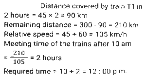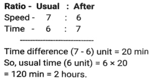 Time, Speed and Distance (Part-2)Total Questions: 5041. Moving at 6/7 of its usual speed, a bus is 20 minutes late. What is its usual time to cover the journey? [SSC CHSL 02/07/2024 (2nd Shift)](a) 3 hours(b) 4 hours(c) 1.5 hours(d) 2 hoursCorrect Answer: (d) 2 hoursSolution:42. Mithila covers 50 km by bus in 90 minutes. After deboarding the bus, she takes rest for 15 minutes and covers another 30 km by a taxi in 35 minutes. Find the average speed (in km/h) for the whole journey. [SSC CHSL 02/07/2024 (3rd Shift)](a) 34²⁄₇(b) 32²⁄₇(c) 31²⁄₇(d) 33²⁄₇Correct Answer: (a) 34²⁄₇Solution:43. A policeman received information that a thief is at a distance of 1.5 km from him. The thief starts moving by car and the policeman chases him by car. The thief and the policeman are moving at the speeds of 90 km/h and 120 km/h respectively. At what distance (in km) will the police catch the thief? [SSC CHSL 02/07/2024 (3rd Shift)](a) 45.0 km(b) 4.5 km(c) 6 km(d) 5 kmCorrect Answer: (c) 6 kmSolution:44. Two trains of lengths 310 m and 330 m, respectively, are 160 m apart, They start moving towards each other on parallel tracks, at speeds 130 km/h and 158 km/h, respectively. In how much time (in seconds) will the trains cross each other? [SSC CHSL 02/07/2024 (4th Shift)](a) 10(b) 18(c) 8(d) 12Correct Answer: (a) 10Solution:45. Two stations T1 and T2 300 km apart. A car starts from station T1 at 8 am and moves towards station T2 at a speed of 45 km/hr. and at 10 am another car starts from station T2 towards T1 at a speed of 60 km/hr. Then the cars will meet at: [SSC CHSL 03/07/2024 (1st Shift)](a) 12:00 p.m.(b) 11:00 a.m.(c) 1:00 p.m.(d) 10:00 a.mCorrect Answer: (a) 12:00 p.m.Solution:46. A bus driver must complete a 240 km trip in 4 hours. If he averages 70 km an hour for the first 3 hours of his trip, how fast must he travel (in km/h) in the last/final hour? [SSC CHSL 03/07/2024 (1st Shift)](a) 50(b) 60(c) 30(d) 35Correct Answer: (c) 30Solution:47. Ram and Shyam start Walking from the same place in the opposite direction. If Shyam walks at a speed of 5¼ km/hr and Ram at a speed of 3 km/hr, then after how much time will they be 44 km apart? [SSC CHSL 03/07/2024 (4th Shift)](a) 6 hours 20 minutes(b) 4 hours 20 minutes(c) 3 hours 20 minutes(d) 5 hours 20 minutesCorrect Answer: (d) 5 hours 20 minutesSolution:48. Shankar covers a certain distance by a car driving at 40 km/h and he returns to the starting point riding on a scooter with a speed of 20 km/h. Find the average speed of the whole journey. [SSC CHSL 04/07/2024 (1st Shift)](a) 22⅔ km/h(b) 29⅔ km/h(c) 24⅔ km/h(d) 26⅔ km/hCorrect Answer: (d) 26⅔ km/hSolution:49. A car covers a certain distance in 85 minutes, if it runs at a speed of 36 km/hr. The speed at which the car must run to reduce the time of journey to 51 minutes will be: [SSC CHSL 04/07/2024 (3rd Shift)](a) 50 km/hr(b) 60 km/hr(c) 70 km/hr(d) 80 km/hrCorrect Answer: (b) 60 km/hrSolution:50. A girl walking at a speed of 9 km/h crosses a bridge in 45 minutes. Find the length of the bridge in meters. [SSC CHSL 05/07/2024 (1st Shift)](a) 7532(b) 6750(c) 6349(d) 6398Correct Answer: (b) 6750Solution:Submit Quiz« Previous12345