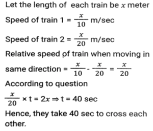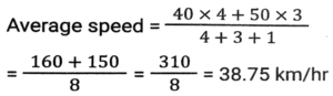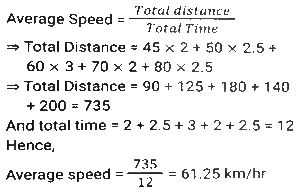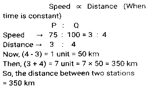 Time, Speed and Distance (Part-3)Total Questions: 5041. A drives for 2 hours, 2.5 hours, 3 hours, 2 hours and 2.5 hours in five days of a week, respectively. His speeds on these days are 45 km/h, 50 km/h, 60 km/h, 70 km/h and 80 km/h, respectively. What is his average speed for the week? [Matriculation Level 21/06/2024 (Shift - 1)](a) 68.02 km/h(b) 60.8 km/h(c) 61.25 km/h(d) 64.08 km/hCorrect Answer: (c) 61.25 km/hSolution:42. Two trains, A and B started travelling towards each other at the same time, from places P to Q and Q to P, respectively. After crossing each other, A and B took 9 hours and 16 hours to reach Q and P, respectively. If the speed of A was 56 km/h, then what was the speed (in km/h) of B? [Matriculation Level 21/06/2024 (Shift - 1)](a) 40(b) 46(c) 42(d) 38Correct Answer: (c) 42Solution:43. A train starts from station P with 'n' number of passengers. At station Q, 20% of the passengers get down and 50 passengers get in. At station R, 40% of the passengers get down and 10 passengers get in. If a total of 520 passengers are left on the train, find the value of 'n'. [Matriculation Level 21/06/2024 (Shift - 4)](a) 855(b) 1000(c) 750(d) 975Correct Answer: (b) 1000Solution:44. A truck driver drove for 4 hours at 40 km/h. He drove for another 3 hours at 50 km/h after taking rest for 1 h. What was the driver's average speed, in km/h, during the whole journey? [Matriculation Level 21/06/2024 (Shift - 4)](a) 40(b) 38.75(c) 39.25(d) 36.50Correct Answer: (b) 38.75Solution:45. Ram goes to his office from his house at a speed of 8 km/h and returns at a speed of 2 km/h. If he takes four hours in going and coming back, find the distance between the house and the office. [Matriculation Level 21/06/2024 (Shift - 4)](a) 6.4 km(b) 5.3 km(c) 7.4 km(d) 6.3 kmCorrect Answer: (a) 6.4 kmSolution:46. A car covers a distance of 45.6 km in 2.4 litres of petrol. How much distance will it cover in 1 litre of petrol? [Matriculation Level 24/06/2024 (Shift - 1)](a) 19 km(b) 20 km(c) 19.4 km(d) 109.44 kmCorrect Answer: (a) 19 kmSolution:47. Ram, standing on a railway platform, noticed that a train took 36 seconds to completely pass through the platform, which was 108 m long, and it took 12 seconds in passing him. Find the speed of the train. [Matriculation Level 24/06/2024 (Shift - 4)](a) 25.2 km/h(b) 18.2 km/h(c) 16.2 km/h(d) 20.2 km/hCorrect Answer: (c) 16.2 km/hSolution:48. A goods train 350 m long passes through a tunnel of 1250m in 80 seconds. What is the speed of the train ? [Matriculation Level 25/06/2024 (Shift - 1)](a) 64 km/h(b) 78 km/h(c) 56 km/h(d) 72 km/hCorrect Answer: (d) 72 km/hSolution:49. Two trains start at the same time from stations P and Q and travel towards each other at the speeds of 75 km/h and 100 km/h, respectively. When they meet, it is found that one train has travelled 50 km more than the other. The distance (in km) between two stations is: [Matriculation Level 25/06/2024 (Shift - 1)](a) 300(b) 350(c) 375(d) 325Correct Answer: (b) 350Solution:50. Two trains of equal length take 10 s and 20 s, respectively, to cross a pole. If these trains are moving in the same direction, then how long will they take to cross each other? [Matriculation Level 25/06/2024 (Shift - 1)](a) 10 sec(b) 15 sec(c) 40 sec(d) 30 secCorrect Answer: (c) 40 secSolution:Submit Quiz« Previous12345