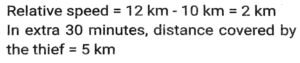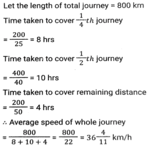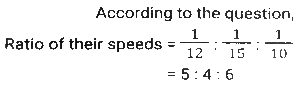 Time, Speed and Distance (Part-4)Total Questions: 5011. A person covers 1/4 of his journey at the speed of 25 km/h, 1/2 of the journey at 40km/h and the remaining at the speed of 50 km/h. Find his average speed per hour for the whole journey (in km/h). [SSC CHSL Tier II (02/11/2023)](a) 34 ⁶⁄₁₁(b) 36 ⁴⁄₁₁(c) 36 ⁴⁄₁₁(d) 34 ⁶⁄₁₁Correct Answer: (b) 36 ⁴⁄₁₁Solution:12. Vipin travels one-third of the distance of a journey at a speed of 30 km/h and the remaining distance at a speed of 40 km/h. If he took a total of 12 hours to complete the journey, what was the total distance (in km) of the journey? [SSC CGL Tier II (26/10/2023)](a) 432(b) 450(c) 445(d) 412Correct Answer: (a) 432Solution:13. A tourist van travels the distance of 35 km from Dehradun to Mussoorie at an average speed of 36 km/h and returns at 60 km/h. What is the approximate average speed (in km/h) of the tourist van for the entire journey? [SSC CPO 03/10/2023 (1st Shift)](a) 45(b) 48(c) 50(d) 42Correct Answer: (a) 45Solution:14. An inspector is 288 metres behind a thief. The inspector runs 42 metres and the thief runs 30 metres in a minute. In how much time will the inspector catch the thief? [SSC CPO 04/10/2023 (1st Shift)](a) 20 minutes(b) 24 minutes(c) 19 minutes(d) 21 minutesCorrect Answer: (b) 24 minutesSolution:Time taken to catch the thief 15. A car, during its entire journey of 5 hours, travels the first 45 minutes at a certain speed, the next 75 minutes at a speed of 85 km/h, and the last 3 hours at a speed of 70 km/h. During its entire journey, the average speed of the car is found to be 73 km/h. What is the speed (in km/h) of the car during the first 45 minutes? [SSC CPO 04/10/2023 (2nd Shift)](a) 62(b) 65(c) 72(d) 68Correct Answer: (b) 65Solution:16. Traveling a distance of 1000 km, a train slowed down due to repairs of the tracks. Its average speed for the trip reduced by 75 km/h and the time of travel increased by 3 hours. The original duration of the travel is: [SSC CPO 04/10/2023 (2nd Shift)](a) 5 hours(b) 6 hours(c) 6.5 hours(d) 5.5 hoursCorrect Answer: (a) 5 hoursSolution:17. The time taken to travel the same distance by three cars is in the ratio of 12 : 15 : 10. What is the ratio of the speeds of the three cars ? [SSC CPO 04/10/2023 (2nd Shift)](a) 4 : 5 : 6(b) 5 : 4 : 6(c) 5 : 6 : 4(d) 4 : 6 : 5Correct Answer: (b) 5 : 4 : 6Solution:18. Jimmy has to cover a distance of 88 km in 16 hours. If she covers half of the journey in 3/4 time, then what should be her speed to cover the remaining distance in the time left? [SSC CPO 04/10/2023 (3rd Shift)](a) 12 km/h(b) 10 km/h(c) 13 km/h(d) 11 km/hCorrect Answer: (d) 11 km/hSolution:19. A vehicle is going at one-fourth of its usual speed and it takes an extra 45 minutes to reach its destination. Its usual time to cover the same distance is: [SSC CPO 04/10/2023 (3rd Shift)](a) 20 minutes(b) 15 minutes(c) 10 minutes(d) 30 minutesCorrect Answer: (b) 15 minutesSolution:20. At 7:30P.M. the owner of a Cycle noticed that a thief is taking away his cycle from his home and is cycling in a particular direction at an estimated speed of 10 km per hour. He informed the police about the theft and the policeman started from the same point, half an hour later than the time of the theft but with a speed of 12 km per hour. At what time will Policeman catch the thief? [SSC CPO 05/10/2023 (1st Shift)](a) 10:00 PM.(b) 10:30 P.M.(c) 10:45 Р.М.(d) 9:30 P.M.Correct Answer: (b) 10:30 P.M.Solution:Submit Quiz« Previous12345Next »