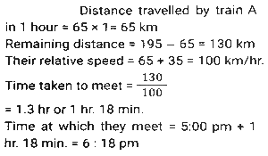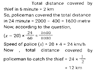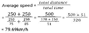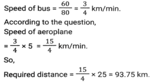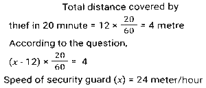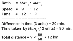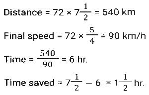 Time, Speed and Distance (Part-5)Total Questions: 5011. Sudhin cycled at 8.5 km/h for 4 hours, then took an auto and travelled at 20 km/h for 1.5 hours, and then walked at 4 km/h for y hours. If Sudhin's overall average speed for the entire journey was 10 km/h, what is the value of y? [SSC CGL 18/07/2023 (4th shift)](a) 2(b) 1.25(c) 1.5(d) 1.75Correct Answer: (c) 1.5Solution:12. On day one, with speed v, R covers a distance x, in t time. On the next day, he covers a distance 2.5x in 0.75t time. What is his speed the next day? [SSC CGL 19/07/2023 (1st shift)](a) 3.5 v(b) (10/3) v(c) 4.5 v(d) (5/3) vCorrect Answer: (b) (10/3) vSolution:13. A thief committed a crime and escaped from the spot at a speed of 12 m/h. A Security guard started chasing him 20 minutes after the thief started running and caught him in the next 20 minutes. What is the speed (in meter/hour) of the Security guard? [SSC CGL 19/07/2023 (2nd shift)](a) 24(b) 30(c) 32(d) 36Correct Answer: (a) 24Solution:14. Ram rides at the rate of 36 km/h but stops for five minutes to take a drink at the end of every 10 km. Find the time that Ram will take to cover a distance of 84 km. [SSC CGL 20/07/2023 (4th shift)](a) 180 minutes(b) 60 minutes(c) 220 minutes(d) 120 minutesCorrect Answer: (a) 180 minutesSolution:Total drink break taken by ram = 8 × 5 = 40 min. = 84/36 = 21/9 hours = 140 min. Total time = 140 + 40 = 180 min.15. The distance between two towns is covered in 7 hours and 30 minutes at the speed of 72 km/h. The time saved if the speed is increased by 25% is: [SSC CGL 21/07/2023 (2nd shift)](a) 1 hour 36 minutes(b) 1 hour 50 minutes(c) 1 hour 30 minutes(d) 1 hour 20 minutesCorrect Answer: (c) 1 hour 30 minutesSolution:16. S₁ and S₂ are two stations which are 195 km apart. A train starts from S₁ at 4:00 pm and moves towards S₂ at the speed of 65 km/h. Another train starts from S₂ at 5:00 pm and moves towards S₁ at the speed of 35 km/h. At what time will the two trains meet? [SSC CGL 21/07/2023 (3rd shift)](a) 6:06 p.m(b) 6:30 p.m(c) 6:15 p.m.(d) 6:18 p.mCorrect Answer: (d) 6:18 p.mSolution:17. Two men walk from a place at speeds of 9 km/h and 12 km/h, respectively. The first man takes 20 minutes more than the second one to cover the journey. Find the distance of the journey. [SSC CGL 24/07/2023 (2nd shift)](a) 10 km(b) 13 km(c) 15 km(d) 12 kmCorrect Answer: (d) 12 kmSolution:18. An airplane travels five times as fast as a bus. If the bus covers 60 km in 80 minutes, then what distance (in km) will the airplane cover in 25 minutes? [SSC CGL 24/07/2023 (3rd shift)](a) 95.35(b) 93.75(c) 65.35(d) 18.75Correct Answer: (b) 93.75Solution:19. Ramesh, on his way to his hometown, travelled the first 250 km at a speed of 75km/h and the next 250 km at a speed of 85 km/h. Find the average speed for the whole journey (correct to 2 decimal places). [SSC CGL 25/07/2023 (2nd shift)](a) 80.55km/h(b) 79.69km/h(c) 79.20km/h(d) 80.69km/hCorrect Answer: (b) 79.69km/hSolution:20. A thief steals an item and escapes, running at 20 km/h. A policeman arrives at the spot of the crime after 6 minutes and immediately starts chasing the thief. 24 minutes after the policeman started to chase the thief, there is still a gap of 400 m between the two. At what distance from the spot of crime would the policeman catch up with the thief, and what is the speed at which the policeman ran ? [SSC CGL 26/07/2023 (1st shift)](a) 15 km; 25 km/h(b) 14.4 km; 24 km/h(c) 10 km; 25 km/h(d) 12 km; 24 km/hCorrect Answer: (d) 12 km; 24 km/hSolution:Submit Quiz« Previous12345Next »