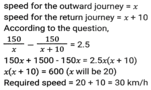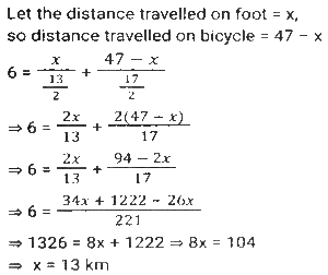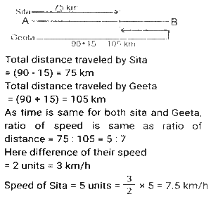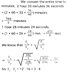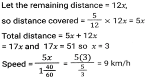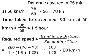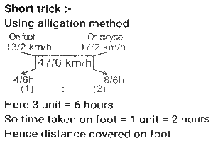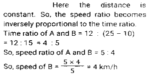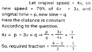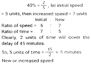 Time, Speed and Distance (Part-7)Total Questions: 5031. A man travelled a distance of 47 km in 6 hours. He travelled partly on foot at the rate of 6½ km/h and partly on bicycle at the rate of 8½ km/h. The distance travelled on foot is: [SSC MTS 11/10/2021 (Afternoon)](a) 13 km(b) 15 km(c) 12 km(d) 16 kmCorrect Answer: (a) 13 kmSolution:32. A lady walks to her office every day from home and maintains a fixed time for the same. On one day she decreases her speed by 25%. By what fraction of her usual time will she be late on that day? [SSC MTS 12/10/2021 (Afternoon)](a) 2/3(b) 1/4(c) 1/3(d) 1/6Correct Answer: (c) 1/3Solution:33. Sita and Geeta start at the same time to ride from place A to place B, which is 90 km away from A. Sita travels 3 km per hour slower than Geeta. Geeta reaches place B and at once turns back meeting Sita 15 km from place B. Sita's speed (in km/h) is: [SSC MTS 13/10/2021 (Morning)](a) 9(b) 6(c) 10.5(d) 7.5Correct Answer: (d) 7.5Solution:34. Two girls move in opposite directions, one from A to B and the other from B to A. The girl from A reaches the destination in 12 minutes. The girl from B stops on the way for 10 minutes and reaches her destination in 25 minutes. If A's speed is 5 km/h, then what is the speed of B (in km/h)? [SSC MTS 13/10/2021 (Afternoon)](a) 3(b) 1⁵⁄₇(c) 4(d) 2.4Correct Answer: (c) 4Solution:35. While covering a distance of 51 km, a man noticed that after walking for one hour and 40 minutes, the distance covered by him was 5/12 of the remaining distance. What was his speed (in km/h)? [SSC MTS 18/10/2021 (Morning)](a) 7(b) 10(c) 8(d) 9Correct Answer: (d) 9Solution:36. An earthworm of length 18 cm is crawling along a certain path with a speed of 4 cm/s. An insect overtakes the earthworm in 6 s. How fast (in cm/s) is the insect walking? Assume that they both are walking along parallel paths. [SSC MTS 20/10/2021 (Evening)](a) 7.0(b) 6.5(c) 5.5(d) 6.0Correct Answer: (a) 7.0Solution:37. An airplane took off from the starting point 45 minutes later than the scheduled time. The destination was 2100 km away from the starting point. To reach on time, the pilot had to increase the speed by 40% of its usual speed. What was the increased speed (in km/h)? [SSC MTS 22/10/2021 (Morning)](a) 1870(b) 2520(c) 2940(d) 1120Correct Answer: (d) 1120Solution:38. A person traveled a distance of 150 km and then returned to the starting point. The time taken for the outward journey was 2½ hours more than that for the return journey. His speed for the return journey was 10 km/h more than that for the outward journey. His speed for the return journey, in km/h, was: [SSC MTS 26/10/2021 (Afternoon)](a) 30(b) 35(c) 25(d) 20Correct Answer: (a) 30Solution:39. A truck driver has to cover a total distance of 260 km in 4 hours. He drives at a speed of 56 km/h for the first 75 minutes, and the next 90 km at a speed of 60 km/h. At what speed (in km/h) must he drive the remaining distance in order to complete the journey in 4 hours? [SSC MTS 02/11/2021 (Morning)](a) 65(b) 58(c) 80(d) 75Correct Answer: (c) 80Solution:40. Two cyclists start simultaneously from two points A and B, their destinations being B and A, respectively. After crossing each other, they precisely take 2 hours 33 minutes 36 seconds and 1 hour 26 minutes 24 seconds respectively to reach their destinations. What is the ratio of the speed of the first to that of the second cyclist? [SSC MTS 02/11/2021 (Evening)](a) 2:3(b) 3:2(c) 4:3(d) 3:4Correct Answer: (d) 3:4Solution:Submit Quiz« Previous12345Next »