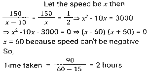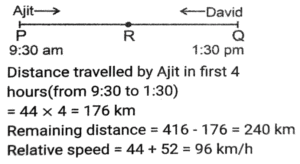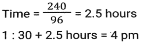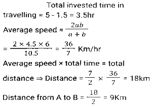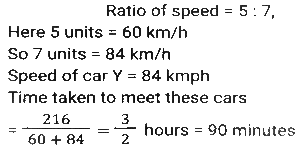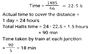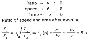 Time, Speed and Distance (Part-7)Total Questions: 5041. The speed of light is very nearly equal to 3 x 10¹⁷ nanometre per second. How much time (in seconds), approximately, does it take light to travel from the moon to the earth, the average distance between them being 384000 km? (1 nanometre = 10⁻⁹ metre) [SSC MTS 02/11/2021 (Evening)](a) 38.4(b) 12.8(c) 3.84(d) 1.28Correct Answer: (d) 1.28Solution:42. Two clocks were synchronized at 11 a.m. on a Sunday. Thereafter, every day they were, respectively, found to gain and lose one minute per day. What time, expressed in hours and minutes, will the second clock show when the first clock shows 10 p.m. on the next Friday? [SSC MTS 12/10/2021 (Afternoon)](a) 9 hours 48³⁄₁₁ minutes p.m.(b) 9 hours 48⁷⁄₁₁ minutes p.m.(c) 9 hours 49¹⁄₁₂ minutes p.m.(d) 9 hours 49⁹⁄₁₁ minutes p.m.Correct Answer: (c) 9 hours 49¹⁄₁₂ minutes p.m.Solution:43. A takes 8 hours more than the time taken by B to cover a distance of 160 km. If A doubles his speed, he takes 3 hours more than B to cover the same distance. Speed of B (in km/h) is? [SSC CGL 17/08/2021 (Morning)](a) 72(b) 80(c) 70(d) 75Correct Answer: (b) 80Solution:Speed of A = 1:2 Time of A = 2:1 (2-1) unit = (8-3) hours = 5 hours ⇒ 2 unit = 10 hours Time of B is 8 hours less than A Time of B = 10 - 8 = 2 hours Speed of B = 160/2 = 80 km/h44. Akhil takes 30 minutes extra to cover a distance of 150 km if he drives 10 km/h slower than his usual speed. How much time will he take to drive 90 km if he drives 15 km per hour slower than his usual speed? [SSC CGL 18/08/2021 (Morning)](a) 2 h 15 m(b) 2 h(c) 2 h 45 m(d) 2 h 30 mCorrect Answer: (b) 2 hSolution:45. A person moved from place A for place B at 2 p.m at a speed of 4.5 km/h, stayed at place B for 1.5 hours and returned to place A at a speed of 6 km/h. He came back to place A at 7 p.m. What is the distance (in km) between places A and B. [SSC CHSL 13/4/2021 (Evening)](a) 8⅓(b) 8⅖(c) 9(d) 9⁶⁄₁₁Correct Answer: (c) 9Solution:46. Two cars X and Y start running towards each other from two places 216 km apart. The ratio of the speeds of X and Y is 5:7 and the speed of X is 60 km/h. After how many minutes will X and Y meet each other? [SSC CHSL 19/04/2021 (Morning)](a) 75(b) 72(c) 90(d) 80Correct Answer: (c) 90Solution:47. A train travels at a speed of 66 km/h and halts at five junctions for a certain time. It covers a distance of 1485 km in one day. For how long (in minutes) does the train stop at each junction, if it halts for the same period of time at all the junctions? [SSC CHSL 05/08/2021 (Afternoon)](a) 15(b) 18(c) 12(d) 20Correct Answer: (b) 18Solution:48. During his morning walk, Atul walks for 45 minutes at a speed of 8km/h and takes 15 rounds of a park. Shekhar takes 10 rounds of the same park in 40 minutes. What is the speed of Shekhar in km/h? [SSC CHSL 05/08/2021 (Evening)](a) 7.2(b) 6(c) 6.75(d) 7.5Correct Answer: (b) 6Solution:49. Ajit Singh left from place Pat 9:30 am for place Q, and David Raj left place Q at 1:30 for place P. The distance between them is 416 km. If Ajit Singh's speed is 44 km/h and David Raj's speed is 52 km/h, then at what time will they meet each other? [SSC CHSL 11/08/2021 (Afternoon)](a) 4.30 pm(b) 5 pm(c) 6 pm(d) 4 pmCorrect Answer: (d) 4 pmSolution:50. A and B start moving towards each other X and Y, respectively, at the same of A is 20% more than the speed of B. After meeting on the way, A and B take p hours and 7⅕ hours, respectively. What is the value of p ? [SSC CGL Tier II (15/11/2020)](a) 5(b) 5.5(c) 6(d) 4.5Correct Answer: (a) 5Solution:Submit Quiz« Previous12345