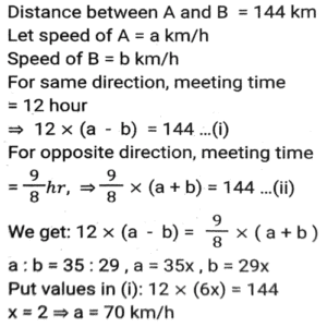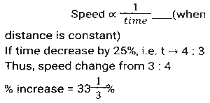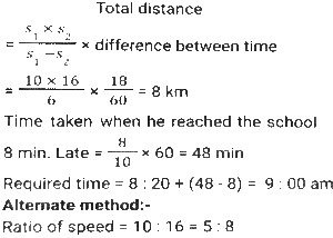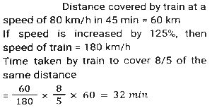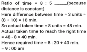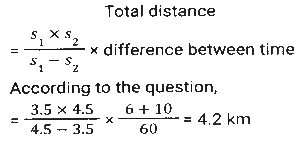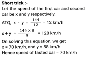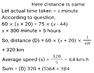 Time, Speed and Distance (Part-8)Total Questions: 101. Amita travels from her house at 3½ km/h and reaches her school 6 minutes late. The next day she travels at 4½ km/h and reaches school 10 min early. What is the distance (in km) between her house and the school? [SSC CGL Tier II (16/11/2020)](a) 5.4(b) 5.6(c) 4.8(d) 4.2Correct Answer: (d) 4.2Solution:2. The distance between the places Hand O is D units. The average speed that gets a person from H to O in a stipulated time is S units. He takes 20 minutes more time than usual if he travels at 60 km/h, and reaches 44 minutes early if he travels 75 km/h. The sum of the numerical values of D and S is: [SSC CHSL 13/10/2020 (Afternoon)](a) 358(b) 384(c) 376(d) 344Correct Answer: (b) 384Solution:3. Two trains start at the same time from stations A and B, 1800 km apart, and proceed towards each other at an average speed of 44 km/h and 46 km/h, respectively. Where will the trains meet? [SSC CHSL 16/10/2020 (Afternoon)](a) 920 km from station A(b) 900 km from station B(c) 880 km from station A(d) 880 km from station BCorrect Answer: (c) 880 km from station ASolution:4. How much time (in minutes) will a dog take to run around a square field of side 75 m if it runs at the rate of 6 km/hr? [SSC CHSL 19/10/2020 (Evening)](a) 2.5(b) 3.6(c) 3(d) 1.8Correct Answer: (c) 3Solution:5. A train takes 45 minutes to cover a certain distance at a speed of 80 km/h. If the speed is increased by 125%, then how long will it take (in minutes) the train to cover 8/5 of the same distance? [SSC CHSL 26/10/2020 (Morning)](a) 25(b) 30(c) 32(d) 28Correct Answer: (c) 32Solution:6. Ravi starts for his school from his house on his cycle at 8:20 a.m. If he runs his cycle at a speed of 10 km/h, he reaches his school 8 minutes late, and if he drives the cycle at a speed of 16 km/h, he reaches his school 10 minutes early. The school starts at: [SSC CHSL 18/03/2020 (Morning)](a) 8:50 a.m.(b) 8:40 a.m.(c) 9:00 a.m.(d) 9:40 a.m.Correct Answer: (c) 9:00 a.m.Solution:7. Places A and B are 144 km apart. Two cars start simultaneously, one from A and the other from B. If they move in the same direction, they meet after 12 hours, but if they move towards each other they meet after 9/8 hours. The 8 speed(in km/h) of the car moving at a faster speed, is: [SSC CGL 04/04/2020 (Evening)](a) 70(b) 72(c) 60(d) 64Correct Answer: (a) 70Solution:8. A student takes 1.25 hours to travel from home to school at a speed of 4 km/h. By what percentage should he increase his speed to reduce the time by 25% to cover the same distance from school to home? [SSC CGL 06/03/2020 (Morning)](a) 45%(b) 50%(c) 25%(d) 33⅓ %Correct Answer: (d) 33⅓ %Solution:9. Two cyclists X and Y start at the same time from place A to go towards place B at a speed of 6 km/h and 8 km/h, respectively. Despite stopping for 15 minutes during the journey, Y reaches 10 minutes earlier than X. The distance between the places A and B (in km) is: [SSC CGL 06/03/2020 (Afternoon)](a) 10(b) 16.5(c) 8(d) 6Correct Answer: (a) 10Solution:10. Two cars A and B leave Delhi at 8:30 a.m. and 9 a.m. for Shimla, respectively. They travel at the speeds of 40km/h and 50 km/h respectively. How many kilometers away from Delhi will the two cars be together? [SSC CGL 07/03/2020 (Morning)](a) 200(b) 45(c) 100(d) 5Correct Answer: (c) 100Solution:Submit Quiz