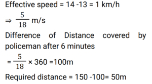 5. A thief saw a policeman from a distance of 150 m. The thief immediately started running at a speed of 13 km/h and the policeman chased him at a speed of 14 km/h. Find the distance between them after running for 6minutes [Group D 26/08/2022 (Afternoon) ]