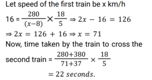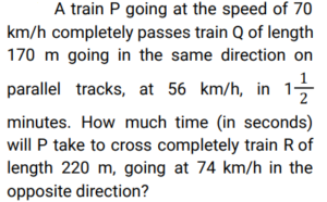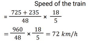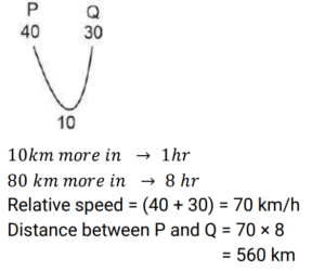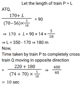Time Speed and Distance (Railway Maths) (Part – II)Total Questions: 501. A 725 m long train passes through a 235 m long tunnel in 48 sec. Find the speed of the train. [Group D 30/08/2022 (Morning) ](a) 82 km/h(b) 72 km/h(c) 54 km/h(d) 66 km/hCorrect Answer: (b) 72 km/hSolution:2. Two trains start from P and Q, respectively, at the same time and run towards each other at a speed of 40km/h and 30 km/h, respectively. By the time they meet, the first train has covered 80 km more than the other train. Find the distance between P and Q . [Group D 30/08/2022 (Evening) ](a) 660 km(b) 240 km(c) 560 km(d) 630 kmCorrect Answer: (c) 560 kmSolution:3. If John travels a distance of 90 km at a speed of 30 km/h and returns at a speed of 60 km/h, his average speed is: [Group D 01/09/2022 (Morning) ](a) 60 km/h(b) 40 km/h(c) 45 km/h(d) 30 km/hCorrect Answer: (b) 40 km/hSolution:4. Find the answer of given question? [Group D 01/09/2022 (Afternoon) ](a) 15(b) 12(c) 10(d) 14Correct Answer: (c) 10Solution:5. A 280 m long train overtakes a man moving at a speed of 8 km/h (in the same direction) in 16 seconds. How much time (in seconds) will it take this train to completely cross another 380 m long train, moving in the opposite direction at a speed of 37 km/h? [Group D 01/09/2022 (Evening) ](a) 25(b) 28(c) 22(d) 20Correct Answer: (c) 22Solution:6. Find the answer of given question? [Group D 01/09/2022 (Evening) ](a) 179(b) 139(c) 200(d) 159Correct Answer: (a) 179Solution:7. A man has to cover a distance of 150 km in 12 hours. If he covers two-third of this distance in 5/8 of the time, then what should be his speed (in km/h, correct to one decimal place) to cover the remaining distance in the time left? [Group D 02/09/2022 (Afternoon) ](a) 11.1(b) 6.7(c) 10.5(d) 11.5Correct Answer: (a) 11.1Solution:8. A train crosses a telegraph post and a bridge of length 300 metres in 10 seconds and 20 seconds, respectively. Find the speed of the train. [Group D 05/09/2022 (Evening) ](a) 75 km/h(b) 89 km/h(c) 69.5 km/h(d) 108 km/hCorrect Answer: (d) 108 km/hSolution:9. Find the answer of given question? [Group D 06/09/2022 (Afternoon) ](a)(b)(c)(d)Correct Answer: (b)Solution:10. A train overtakes two persons who are walking at 15 m/s and 35 m/s, respectively, in the same direction as that of the train in 20 seconds and 40 seconds, respectively. The length of the train is: [Group D 08/09/2022 (Morning) ](a) 1000 m(b) 900 m(c) 800 m(d) 700 mCorrect Answer: (c) 800 mSolution:Submit Quiz12345Next »