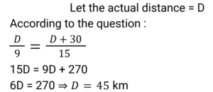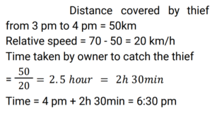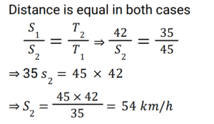 Time Speed and Distance (Railway Maths) (Part – III)Total Questions: 5031. If a man travels at a speed of 15 km/h instead of travelling at a speed of 9 km/h, he travels 30 km more. The actual distance travelled by him is. [RRB NTPC 18/01/2021 (Evening)](a) 45 km(b) 43 km(c) 42 km(d) 41 kmCorrect Answer: (a) 45 kmSolution:32. A map of a city is drawn on a scale of 1 : 50000. The distance between two cities A and B on this map is 12 cm. What will be the actual distance between the two cities? [RRB NTPC 19/01/2021 (Evening)](a) 15 km(b) 12 km(c) 6 km(d) 9 kmCorrect Answer: (c) 6 kmSolution:A map of a city is drawn on a scale of 1 : 50000. The distance between two cities A and B on this map is 12 cm. The actual distance between the two cities = 12 × 50000 cm = 600000 cm So, The distance between the two cities is 6 km.33. If a train runs at an average speed of 42 km/h, then it covers a certain distance in 45 min. What is the speed at which the train must run to reduce the time of the same journey to 35 min? [RRB NTPC 21/01/2021 (Morning) ](a) 49 km/h(b) 54 km/h(c) 52 km/h(d) 52.5 km/hCorrect Answer: (b) 54 km/hSolution:34. A certain distance (d) is covered by a cyclist at a certain speed. If a jogger covers half the distance in double the time (t), then the ratio of the speed of the cyclist to the speed of the jogger is. [RRB NTPC 21/01/2021 (Evening)](a) 2 : 1(b) 4 : 1(c) 3 : 4(d) 1 : 2Correct Answer: (b) 4 : 1Solution:35. Sohan and Mohan start from the school with a speed of 3.5 km/hr and 4 km/hr. What time will they take to be 1.5 km apart if they start in the same direction? RRB NTPC 22/01/2021 (Morning) [RRB NTPC 22/01/2021 (Morning)](a) 9 min(b) 3 hours(c) 1 hour(d) 12 minCorrect Answer: (b) 3 hoursSolution:36. Ravikant cycles at a speed of 12.5 km/h and walks at a speed of 3 km/h. To cover a distance of 40 km by cycle and walk both, Ravikant took 7 hours. How many of these hours were spent cycling? [RRB NTPC 23/01/2021 (Evening)](a) 4(b) 5(c) 2(d) 3Correct Answer: (c) 2Solution:37. A thief steals a bag from the car at 3 pm and drives away at a speed of 50 km/h. The thief is located at 4 p.m. and the owner sets off in his car at a speed of 70 km/h. When will he catch the thief? [RRB NTPC 23/01/2021 (Evening)](a) 6 : 30 pm(b) 8 : 00 pm(c) 6 : 00 pm(d) 8 : 45 pmCorrect Answer: (a) 6 : 30 pmSolution:38. Two trains start at the same time from two stations and proceed towards each other at the speeds of 20 km/h and 25 km/h respectively. When they meet, it is found that one train has travelled 80 km more than the other. Find the distance between the two stations. [RRB NTPC 25/01/2021 (Morning)](a) 720 km(b) 700 km(c) 730 km(d) 710 kmCorrect Answer: (a) 720 kmSolution:39. If a motor car travels the first half of a distance at a speed of 30 km/h and the remaining half distance at a speed of 50 km/h, what will be its average speed? [RRB NTPC 27/01/2021 (Morning)](a) 37.5 km/h(b) 45 km/h(c) 40 km/h(d) 37 km/hCorrect Answer: (a) 37.5 km/hSolution:40. Two trains start from Delhi and Patna, and travel towards Patna and Delhi, respectively. After passing each other, they take 4 h 48 min and 3 h 20 min to reach Patna and Delhi, respectively. If the train starting from Delhi is moving at a speed of 45 km/h, then find the speed of the other train. [RRB NTPC 27/01/2021 (Evening) ](a) 55 km/h(b) 50 km/h(c) 54 km/h(d) 52 km/hCorrect Answer: (c) 54 km/hSolution:Submit Quiz« Previous12345Next »