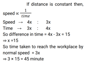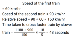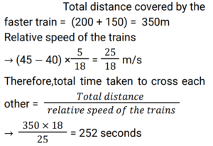 Time Speed and Distance (Railway Maths) (Part – V)Total Questions: 5021. A man walks from P to Q at the rate of 5 km/h and returns from Q to P at 3 km/h. What is his average speed for the whole journey? [RRB JE 22/05/2019 (Evening)](a) 3.5 km/h(b) 8 km/h(c) 3.75 km/h(d) 3.25 km/hCorrect Answer: (c) 3.75 km/hSolution:22. Buses come out of a bus terminus in intervals of 10 minutes at 20 km/h. A man coming from the opposite direction towards the terminus meets the buses at intervals of 8 minutes. What is his speed? [RRB JE 22/05/2019 (Evening)](a) 4 km/h(b) 5 km/h(c) 3.75 km/h(d) 6 km/hCorrect Answer: (b) 5 km/hSolution:23. A train 120 m long crosses a platform of length 100 m in 10 seconds. What is its speed? [RRB JE 22/05/2019 (Evening) ](a) 100 km/h(b) 79.2 km/h(c) 72 km/h(d) 80 km/hCorrect Answer: (b) 79.2 km/hSolution:24. Two places P and Q are 400 miles apart. A car starts from P at a speed of 50 mph towards Q. After 75 minutes, another car starts from Q to P at a speed of 40 mph. At what time will the cars meet? [RRB JE 23/05/2019 (Afternoon)](a) 4 hours 30 minutes(b) 5 hours(c) 4 hours(d) 2 hours 45 minutesCorrect Answer: (b) 5 hoursSolution:25. How long does a train 110 m long running at a speed of 72 km/h take to cross a bridge 132 metres in length? [RRB JE 23/05/2019 (Afternoon)](a) 12.42 seconds(b) 12.1 seconds(c) 9.8 seconds(d) 14.3 secondsCorrect Answer: (b) 12.1 secondsSolution:26. In covering a certain distance, two persons travel at speeds in the ratio 18 : 12. What is the ratio of the time taken by them? [RRB JE 23/05/2019 (Evening) ](a) 2 : 5(b) 2 : 3(c) 2 : 1(d) 3 : 2Correct Answer: (b) 2 : 3Solution:27. Two trains are moving in opposite directions at 60 km/hr and 90 km/hr. Their lengths are 1.10 km and 0.9 km respectively. What is the time taken by the slower train to cross the faster train in seconds? [RRB JE 24/05/2019 (Afternoon) ](a) 36 seconds(b) 48 seconds(c) 49 seconds(d) 45 secondsCorrect Answer: (b) 48 secondsSolution:28. Travelling at 3/4 of the normal speed, a person reaches his workplace 15 minutes late. How many minutes does he take usually to reach the workplace? [RRB JE 24/05/2019 (Evening) ](a) 30 minutes(b) 42 minutes(c) 45 minutes(d) 60 minutesCorrect Answer: (c) 45 minutesSolution:29. Around a circular track of 120 m, P and Q start running simultaneously from the same point in the same direction at 20 m/min and 12 m/min. At how many points will they meet? [RRB JE 24/05/2019 (Evening)](a) 4(b) 2(c) 1(d) 3Correct Answer: (b) 2Solution:30. Two trains 200 m and 150 m long are running on parallel tracks at the rates of 40 km/h and 45 km/h respectively. In how much time will they cross each other if they are running in the same direction? [RRB JE 25/05/2019 (Morning)](a) 72 seconds(b) 132 seconds(c) 192 seconds(d) 252 secondsCorrect Answer: (d) 252 secondsSolution:Submit Quiz« Previous12345Next »