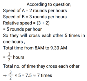 2. A and B walk along a circular path in opposite directions with speeds of 2 rounds per hour and 3 rounds per hour respectively. If they start at the same time from the same point at 8 AM, how many times will they cross each other by 9:30AM? [RRB JE 27/06/2019 (Evening) ]