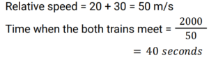 10. Two trains start moving towards each other at a distance of 2000 metres. The first train moves at a speed of 20m/s and the second at a speed of 30m/s. After how many seconds do they meet each other? [ALP Tier II 21/01/2019 (Evening) ]