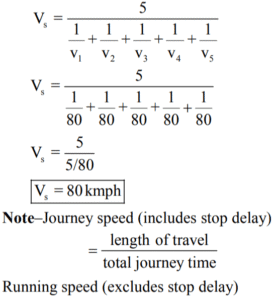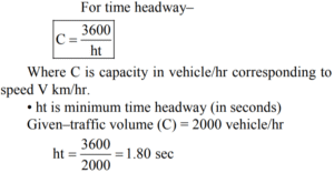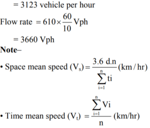 Transportation Engineering (General Engineering) (SSC JE)Total Questions: 4721. Determine headway between the vehicles if the traffic volume is observed as 2000 vehicles/hr. [BPSC AE (Civil) 25.03.2022 ](a) 1.80 sec(b) 1.54 sec(c) 1.44 sec(d) 1.50 secCorrect Answer: (a) 1.80 secSolution:22. Speed limit signage is installed at [BPSC AE (Civil) 25.03.2022 ](a) 50ᵗʰ Percentile speed(b) 98ᵗʰ Percentile speed(c) 85ᵗʰ Percentile speed(d) 15ᵗʰ Percentile speedCorrect Answer: (c) 85ᵗʰ Percentile speedSolution:Figure • In highway geometric design cumulative speed distribution is drawn and design is checked at 98th percentile. • 98th percentile speed–It is the speed at or below which 98% of vehicle are moving. • 85th percentile speed–It is the speed at or below which 85% of vehicle are moving. • 15th percentile speed–It is the speed at or below which 15% of vehicle are moving. • It is taken as lower limit of speed.23. Which type of marking is provided in a segment of seven continuous lines? [BPSC AE (Civil) 25.03.2022 ](a) Edge marking(b) Centreline marking(c) Warning line marking(d) Block markingCorrect Answer: (c) Warning line markingSolution:Classification of pavement marking– 1. Longitudinal marking (LM) 2. Transverse marking (TM) 3. Hazard marking (HM) 4. Block marking (BM) 5. Arrow marking (AM) 6. Directional marking (DM) 7. Facility marking (FM) Line marking– 1. Center line 2. Warning line 3. Edge line 4. No-overtaking line • It is applied to various situations like undivided road, divided carriageway roads and one way street/ramp/slip roads. • The center lines should be used only on single carriageway rods to separate the opposite streams of traffic and to facilitate their movements.24. What is the value of standard load at 2.5 mm and 5.0 mm penetration in CBR test? [BPSC AE (Civil) 25.03.2022 ](a) 1370 kg and 2055 kg(b) 1500 kg and 3000 kg(c) 1200 kg and 2000 kg(d) 1350 kg and 2050 kgCorrect Answer: (a) 1370 kg and 2055 kgSolution:C.B.R. standards for crushed stone during testing– Value of load C.B.R. (California Bearing Ratio)–CBR is used to determine the material properties for pavement design. • Maximum value of CBR for any material is 100. • The pressure upto a penetration of 12.5 mm and its ratio to the bearing value of a standard crushed rock is termed as the CBR. • In most cases CBR decreases as thie penetration increases. 25. The loading applied in aggregate crushing value test is [BPSC AE (Civil) 25.03.2022 ](a) 50 tonnes at the rate of 4 tonnes per minute(b) 40 tonnes at the rate of 4 tonnes per minute(c) 50 tonnes at the rate of 5 tonnes per minute(d) 50 tonnes at the rate of 10 tonnes per minuteCorrect Answer: (b) 40 tonnes at the rate of 4 tonnes per minuteSolution:The aggregates crushing value gives a relative measure of resistance of an aggregate to crushing under gradually applied compressive load. This test is conducted on single sized aggregate passing 12.5 mm sieve and retained on 10 mm sieve. The aggregate is tested in a surface dry condition. • The approaches is filled with 3 layers of aggregate and each layer is tamped 25 stocks by the rounded end of tamping rod. 40 tonnes of load is applied at a rate of 4 tonnes/minute. Aggregate crushing value– • A value less than 10 shows strong aggregate while above 35 shows weak aggregate. • For the bituminous concrete a maximum value of 35 is specified. • A maximum value of 40% is allowed for WBM base course in Indian conditions.26. Penetration test of bitumen is carried out at which temperature? [BPSC AE (Civil) 25.03.2022 ](a) 30°C(b) 20°C(c) 25°C(d) 27°CCorrect Answer: (c) 25°CSolution:• It is resistance of flow or measurement of hardness of bitumen. • Distance penetrate is sample by a standard pointed needle at 25ºC when a 100 gm of load is applied for 5 days. • Unit of penetration is 1/10 mm. • Therefore 80/100 means penetration of 8-10 mm • Penetration grade 30/40 to use roads with high volume of traffic. • Penetration 60/70 to use superior type of roads with high traffic in normal summer temperature. • Cut back bitumen is used to premix and surface dressing in cold weather condition. • Emulsion is used to wet condition (rainy season) maintenance work etc.27. There are five vehicles observed at a section of a highway. All vehicles are moving with a speed of 80 kmph respectively. Determine space mean speed. [BPSC AE (Civil) 25.03.2022 ](a) 75 kmph(b) 80 kmph(c) 85 kmph(d) 82.14 kmphCorrect Answer: (b) 80 kmphSolution:Average speed of vehicles over a certain road length at any time. It is the harmonic mean of the speed. Given– Number of vehicle η = 5 All vehicle are moving with a speed = 80 kmph 28. Determine space mean speed if the observed time mean speed is 65 kmph and standard deviation in observed time mean speed is 8.06. [BPSC AE (Civil) 25.03.2022 ](a) 63.85 kmph(b) 63 kmph(c) 64 kmph(d) 66 kmphCorrect Answer: (c) 64 kmphSolution:Given that, Observed time mean speed (Vₜ) = 65 kmph Standard deviation of observed time mean speed ( = 8.06 29. The number of vehicles observed in successive 10-min periods is 600, 450, 500, 575, 610 and 388. Determine traffic volume and flow rate. [BPSC AE (Civil) 25.03.2022 ](a) 3123 vph and 3660 vph(b) 3123 vph and 3000 vph(c) 3660 vph and 3123 vph(d) 3000 vph and 3660 vphCorrect Answer: (a) 3123 vph and 3660 vphSolution:Given that– The number of vehicles– 600, 450, 500, 575, 610 and 388. Observed in successive 10 min periods Find– traffic volume - ? Flow rate - ? Traffic volume = 600 + 450 + 500 + 575 + 610 + 388 30. Dowel bars and tie bars are provided in which type of pavement? [BPSC AE (Civil) 25.03.2022 ](a) Flexible pavement(b) Rigid pavement(c) Semi-rigid pavement(d) Semi-flexible pavementCorrect Answer: (b) Rigid pavementSolution:• Load transfer device across transverse joint and they keep the two slab at same height. • Load transfer capacity of the dowel bar is assumed to be 40% of the