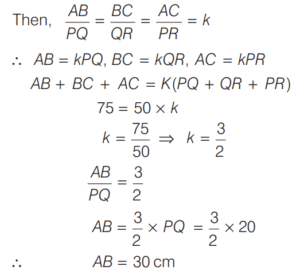 2. The perimeters of two similar triangles ABC and PQR are 75 cm and 50 cm, respectively. If the length of one side of the triangle PQR is 20 cm, then what is the length of corresponding side of the triangle ABC? [2019 (II) Evening Shift]