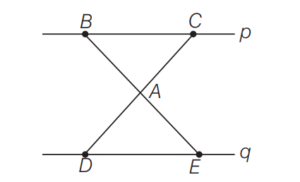 4. let two lines p and a be parallel. Consider two points B and C on the line p and two points D and E on the line q. The line through B and E intersects the line through C and D at A in between the two lines p and q. If AC AD = 4 : 9, then what is the ratio of area of triangle ABC to that of traingle ADE? [2019 (II) Evening Shift]