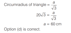 8. (Questions 8 and 9) Read the given information carefully and answer the given question below. An equilateral triangle ABC is inscribed in a circle of radius 20√3 cm. [2019 (I) Morning Shift]