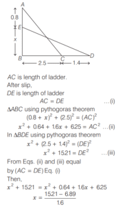 10. A ladder is resting against a vertical wall and its bottom is 2.5 m away from the wall. If it slips 0.8 m down the wall, then its bottom will move away from the wall by 1.4 m. What is the length of the ladder? [2019 (I) Morning Shift]