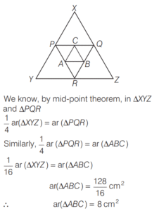3. Suppose P Q, and R are the mid-points of sides of a triangle of area 128 cm² . If a triangle ABC is drawn by joining the mid-points of sides of triangle PQR, then what is the area of triangle ABC? [2019 (II) Evening Shift]