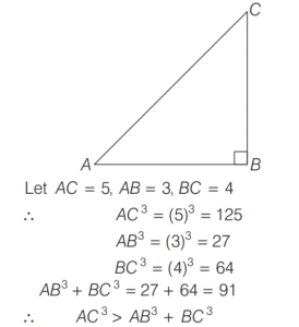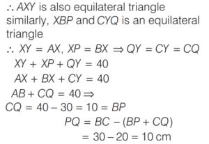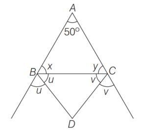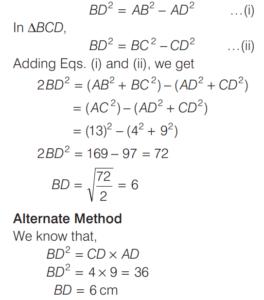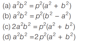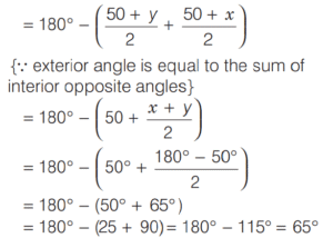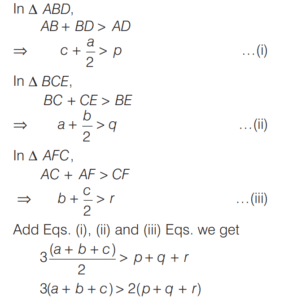 TRIANGLES (CDS)Total Questions: 6911. In the figure given below, ABC is an equilateral triangle with each side of length 30 cm. XY is parallel to BC. XP is parallel to AC and YQ is parallel to AC and YQ is parallel to AB. If XY + XP + YQ is 40 cm, then the value of PQ is [2018 (II) Evening Shift](a) 5 cm(b) 12 cm(c) 15 cm(d) 10 cmCorrect Answer: (d) 10 cmSolution:Given, AB = BC = AC = 30, XY is parallel to BC12. In a triangle ABC, the sides AB, AC are produced and the bisectors of exterior angles of ∠ABC and ∠ACB intersect at D. If ∠BAC = 50º, then ∠BDC is equal to [2018 (II) Evening Shift](a) 115º(b) 65º(c) 55º(d) 40ºCorrect Answer: (b) 65ºSolution:∠BDC = 180° - (u + v) 13. If ABC is a right-angled triangle with AC as its hypotenuse, then which one of the following is correct? [2018 (II) Evening Shift](a) AC³ < AB³ + BC³(b) AC³ > AB³ + BC³(c) AC³ ≤ AB³ + BC³(d) AC³ ≥ AB³ + BC³Correct Answer: (b) AC³ > AB³ + BC³Solution:Here, ABC is a right angle triangle with AC as its hypotenuse14. In the figure given below, ∆ABR ~ ∆PQR. If PQ = 3 cm, AB = 6 cm, BR = 8.2 cm and PR = 5.2 cm, then QR and AR are respectively [2018 (II) Evening Shift](a) 8.2 cm, 10.4 cm(b) 4.1 cm, 6 cm(c) 2.6 cm, 5.2 cm(d) 4.1 cm, 10.4 cmCorrect Answer: (d) 4.1 cm, 10.4 cmSolution:Given, PQ = 3 cm, AB = 6 cm, 15. In the figure given below ABC is a triangle with AB perpendicular to BC. Further BD is perpendicular to AC. If AD = 9 cm and DC = 4cm, then what is the length of BD? [2018 (II) Evening Shift](a) 13/36 cm(b) 36/13 cm(c) 13/2 cm(d) 6 cmCorrect Answer: (d) 6 cmSolution:In ∆ABD,16. ABC is a triangle right angled at C with BC a = and AC b = . If p is the length of the perpendicular from C on AB, then which one of the following is correct? [2018 (I) Morning Shift](a)(b)(c)(d)Correct Answer: (a)Solution:According to the question, 17. Consider the following statements [2018 (I) Morning Shift]1. The orthocentre of a triangle always lies inside the triangle. 2. The centroid of a triangle always lies inside the triangle. 3. The orthocentre of a right angled triangle lies on the triangle. 4. The centroid of a right angled triangle lies on the triangle.Which of the above statements are correct?(a) 1 and 2(b) 1 and 4(c) 2 and 3(d) 2 and 4Correct Answer: (c) 2 and 3Solution:2 and 318. Consider the following statements Two triangles are said to be congruent, if [2018 (I) Morning Shift]1. Three angles of one triangle are equal to the corresponding three angles of the other triangle. 2. Three sides of one triangle are equal to the corresponding three sides of the other triangle. 3. Two sides and the included angle of one triangle are equal to the corresponding two sides and the included angle of the other triangle. 4. Two angles and the included side of one triangle are equal to the corresponding two angles and the included side of the other triangle.Which of the above statements are correct?(a) 1, 2 and 3(b) 1, 3 and 4(c) 1, 2 and 4(d) 2, 3 and 4Correct Answer: (d) 2, 3 and 4Solution:2, 3 and 4 are correct.19. (Questions 19 and 20) Consider the following for the next two (02) questions [2018 (I) Morning Shift]In a triangle ABC, a b, and c are the lengths of the sides and p q, and r are the lengths of its medians.Which one of the following is correct?(a) 2 (p + q + r) = (a + b + c)(b) 2 (p + q + r) > 3(a + b + c)(c) 2 (p + q + r) < 3(a + b + c)(d) 11 (p + q + r) > 10(a + b + c)Correct Answer: (c) 2 (p + q + r) < 3(a + b + c)Solution:Let AB = c , BC = a, CA = b, AD = p, BE = q, CE = r 20. Which one of the following is correct [2018 (I) Morning Shift](a) (a + b + c) < (p + q + r)(b) 3(a + b + c) < 4(p + q + r)(c) 2(a + b + c) > 3(p + q + r)(d) 3(a + b + c) > 4(p + q + r)Correct Answer: (b) 3(a + b + c) < 4(p + q + r)Solution:Submit Quiz« Previous1234567Next »
