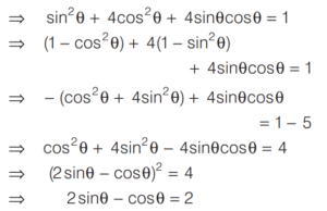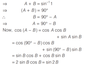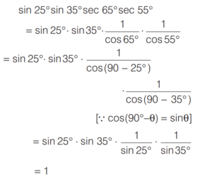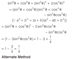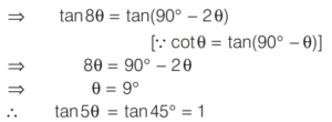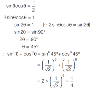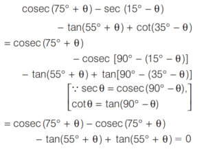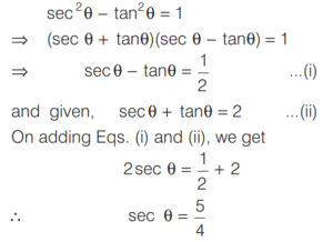 TRIGONOMETRIC RATIOS AND TRIGONOMETRIC IDENTITIES (CDS)Total Questions: 108101. If sin θ cos θ =1/2, then what is sin⁶θ + cos⁶θ equal to? [2014 (I) Morning Shift](a) 1(b) 2(c) 3(d) 1/4Correct Answer: (d) 1/4Solution: 102. If sec θ + tan θ = 2, then what is the value of sec θ? [2014 (I) Morning Shift](a) 3/2(b) √2(c) 5/2(d) 5/4Correct Answer: (d) 5/4Solution:By trigonometric identity,103. What is cosec(75° + θ) - sec(15° - θ) - tan (55° + θ) + cot(35° - θ) equal to? [2014 (I) Morning Shift](a) − 1(b) 0(c) 1(d) 3/2Correct Answer: (b) 0Solution:104. If sin θ + 2cos θ = 1 where 0 < θ < π/2 then what is 2sin θ - cos θ equal to? [2014 (I) Morning Shift](a) - 1(b) 1/2(c) 2(d) 1Correct Answer: (c) 2Solution:sin θ + 2cos θ = 1 On squaring both sides, we get (sin θ + 2cos θ)² = 1105. If cos x + sec x = 2 , then what cosⁿ x + secⁿ x equal to, where n is a positive integer? [2014 (I) Morning Shift](a) 2(b) 2ⁿ⁻²(c) 2ⁿ⁻¹(d) 2Correct Answer: (a) 2Solution:cos x + sec x = 2 ... (i)106. What is sin 25° sin 35° sec 65° sec 55° equal to? [2014 (I) Morning Shift](a) −1(b) 0(c) 1/2(d) 1Correct Answer: (d) 1Solution:107. If tan 8θ = cot 2θ, where 0 < 8θ < π/2, then what is the value of tan 5θ? [2014 (I) Morning Shift](a) 1/√3(b) 1(c) √3(d) 0Correct Answer: (b) 1Solution:Given, tan 8θ = cot 2θ108. If sin (A + B) = 1, where 0 < B < 45°, then what is cos (A - B) equal to? [2014 (I) Morning Shift](a) sin 2B(b) sin B(c) cos 2B(d) cos BCorrect Answer: (a) sin 2BSolution:∵ sin (A + B) = 1Submit Quiz« Previous1234567891011