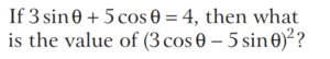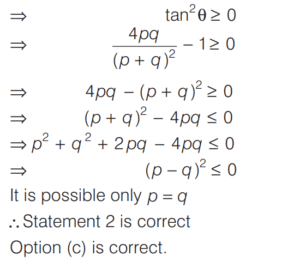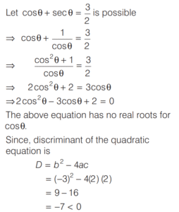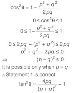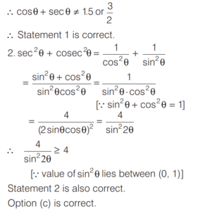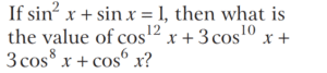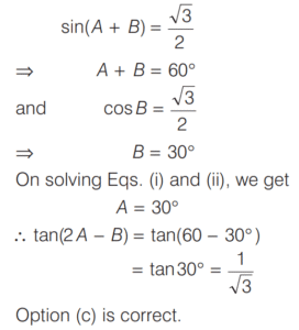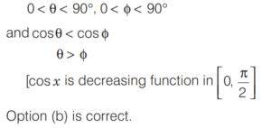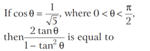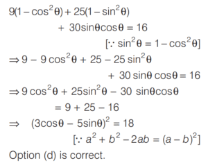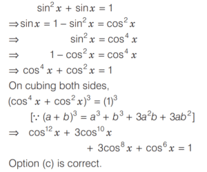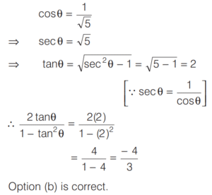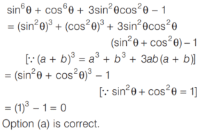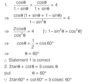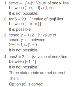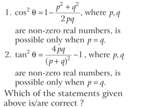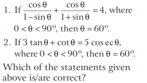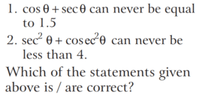 TRIGONOMETRIC RATIOS AND TRIGONOMETRIC IDENTITIES (CDS)Total Questions: 10811. What is the value of sin⁶ θ + cos⁶ θ + 3sin² θ cos² θ - 1 [2019 (I) Morning Shift](a) 0(b) 1(c) 2(d) 4Correct Answer: (a) 0Solution:Given,12. Consider the following for real numbers α, β, γ and δ [2019 (I) Morning Shift]1. sec α = 1/4 2. tan β = 20 3. cosec γ = 1/2 4. cos δ = 2How many of the above statements are not possible?(a) One(b) Two(c) Three(d) FourCorrect Answer: (c) ThreeSolution:α, β, γ and δ are real numbers13. Solve the following equation [2018 (II) Evening Shift](a) 4/3(b) −4/3(c) 1/3(d) −2/3Correct Answer: (b) −4/3Solution:We have,14. If 0 < θ < 90º, 0 < φ < 90º and cos θ < cos φ, then which one of the following is correct ? [2018 (II) Evening Shift](a) θ < φ(b) θ > φ(c) θ + φ = 90º(d) No conclusion can be drawnCorrect Answer: (b) θ > φSolution:15. Let sin (A + B) = √3/2 and cos B = √3/2, where A B, are acute angles. What is tan (2A - B) equal to ? [2018 (II) Evening Shift](a) 1/2(b) √3(c) 1/√3(d) 1Correct Answer: (c) 1/√3Solution:We have,16. Consider the following statements [2018 (II) Evening Shift](a) 1 only(b) 2 only(c) Both 1 and 2(d) Neither 1 nor 2Correct Answer: (c) Both 1 and 2Solution:We have,17. Consider the following statements [2018 (II) Evening Shift](a) 1 only(b) 2 only(c) Both 1 and 2(d) Neither 1 nor 2Correct Answer: (c) Both 1 and 2Solution: 18. Consider the following statements [2018 (II) Evening Shift](a) 1 only(b) 2 only(c) Both 1 and 2(d) Neither 1 nor 2Correct Answer: (c) Both 1 and 2Solution:1. cos θ + sec θ19. Solve the following equation [2018 (II) Evening Shift](a) –1(b) 0(c) 1(d) 8Correct Answer: (c) 1Solution:We have,20. Solve the following equation [2018 (II) Evening Shift](a) 9(b) 12(c) 16(d) 18Correct Answer: (d) 18Solution:Submit Quiz« Previous1234567891011Next »