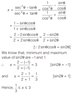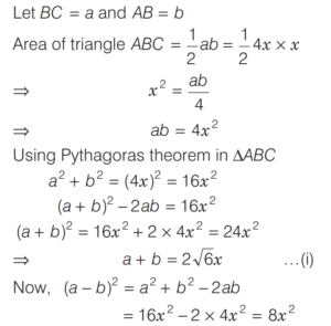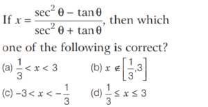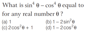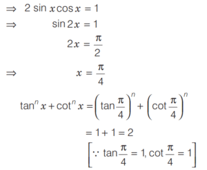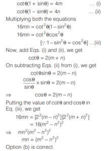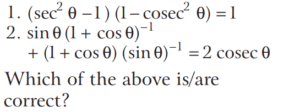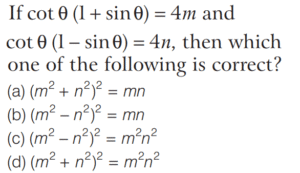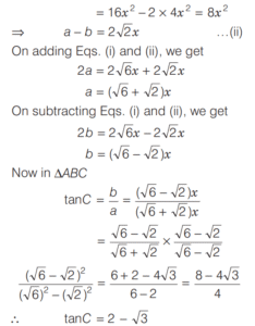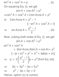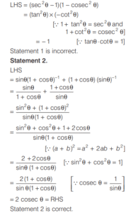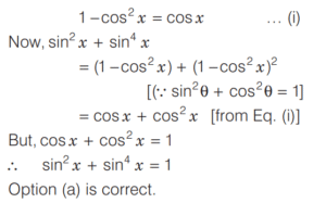 TRIGONOMETRIC RATIOS AND TRIGONOMETRIC IDENTITIES (CDS)Total Questions: 10821. Solve the following equation [2018 (II) Evening Shift](a)(b)(c)(d)Correct Answer: (b)Solution:We have,22. Solve the following equation [2018 (I) Morning Shift](a)(b)(c)(d)Correct Answer: (d)Solution:23. What is cot l° cot 23° cot 45° cot 67° cot 89° equal to ? [2018 (I) Morning Shift](a) 0(b) 1(c) 1/2(d) 1/3Correct Answer: (b) 1Solution:24. Consider the following statements: [2018 (I) Morning Shift](a) 1 only(b) 2 only(c) Both 1 and 2(d) Neither 1 nor 2Correct Answer: (b) 2 onlySolution:Statement 1.25. If sec x cosecx = 2 , then what is tanⁿ x + cotⁿ x equal to? [2018 (I) Morning Shift](a) 2(b) 2ⁿ⁺¹(c) 2ⁿ(d) 27ⁿ⁻¹Correct Answer: (a) 2Solution:We have, 26. If cos x + cos² x = I then what is sin² x + sin⁴ x equal to ? [2018 (I) Morning Shift](a) 1(b) 1.5(c) 2(d) 3Correct Answer: (a) 1Solution:cos x + cos² x = I [Given]27. If sin A + cos A = p and sin³ A + cos³ A = q, then which one of the following is correct? [2018 (I) Morning Shift](a) p³ - 3p + q = 0(b) q³ - 3q + 2p = 0(c) p³ - 3p + 2q = 0(d) p³ + 3p + 2q = 0Correct Answer: (c) p³ - 3p + 2q = 0Solution:Given, sin A + cos A = p ...(i)28. Solve the following equation [2018 (I) Morning Shift](a)(b)(c)(d)Correct Answer: (d)Solution:29. What angle does the hour hand of a clock describe in 10 min of time? [2018 (I) Morning Shift](a) 1º(b) 5º(c) 6º(d) 10ºCorrect Answer: (b) 5ºSolution:The hour hand of the clock covers 360º in 12 h.30. ABC is a right angled triangle with base BC and height AB.The hypotenuse AC is four times the length of the perpendicular drawn to it from the opposite vertex. What is tan C equal to [2018 (I) Morning Shift](a) 2 - √3(b) √3 - 1(c) 2 + √3(d) √3 +1Correct Answer: (a) 2 - √3Solution:According to the question, Submit Quiz« Previous1234567891011Next »