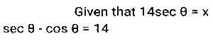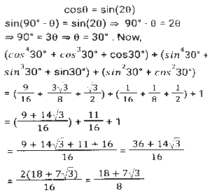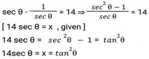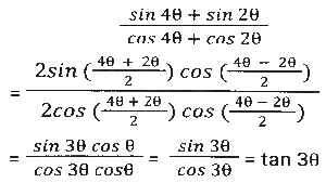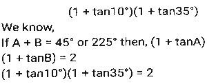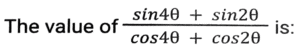 Trigonometry (Part-10)Total Questions: 5021. The value of- [Graduate Level 03/08/2022 (Shift-3)](a) 2(b) 1/2(c) 1/4(d) 4Correct Answer: (b) 1/2Solution:22. Simplify [Graduate Level 04/08/2022 (Shift-4)](a) tanθ(b) 2tanθ(c) cotθ(d) 2cotθCorrect Answer: (a) tanθSolution:23. Simpilfy [Graduate Level 04/08/2022 (Shift-4)](a) sec x(b) tan x(c) cosec x(d) cot xCorrect Answer: (c) cosec xSolution:24. If cosθ = sin(2θ) ≠ 0, what is the value of cos⁴θ + sin⁴θ + cos³θ + sin³θ + sin²θ + cos²θ + sinθ + cosθ ? [Graduate Level 05/08/2022 (Shift-3)](a)(b)(c)(d)Correct Answer: (b)Solution:25. Solve it- [SSC CHSL 25/05/2022 (Morning)](a) 5/12(b) -(5/12)(c) 1/5(d) -(1/12)Correct Answer: (b) -(5/12)Solution:26. If secθ - cosθ = 14 and 14 secθ = x, then the value of x is ________ . [SSC CHSL 25/05/2022 (Afternoon)](a) tan²θ(b) sec²θ(c) 2 secθ(d) 2 tanθCorrect Answer: (a) tan²θSolution:27. The value of (1 + tan10º) (1 + tan35º) is: [SSC CHSL 25/05/2022 (Evening)](a) 1/2(b) 3/4(c) 1(d) 2Correct Answer: (d) 2Solution:28. Simplify [SSC CHSL 27/05/2022 (Morning)](a) tan3θ(b) cot3θ(c) tanθ(d) cotθCorrect Answer: (a) tan3θSolution:29. If sinx - 3cosx = √3cosx, then the value of cot x is_______ . [SSC CHSL 31/05/2022 (Morning)](a)(b)(c)(d)Correct Answer: (d)Solution:30. What is the value of (4sin³x - 3sinx + sin3x) ? [SSC CHSL 31/05/2022 (Afternoon)](a) 1(b) 0(c) 4(d) 3Correct Answer: (b) 0Solution:Submit Quiz« Previous12345Next »