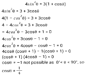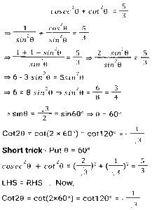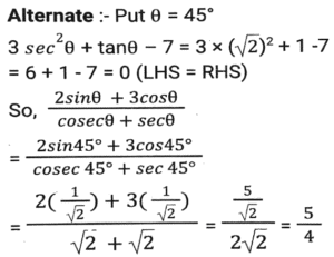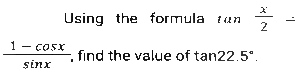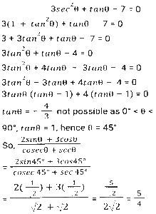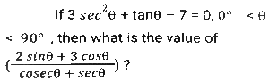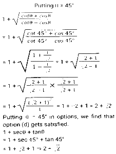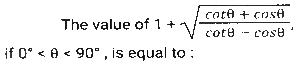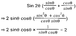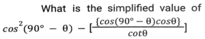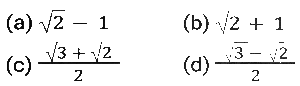 Trigonometry (Part-10)Total Questions: 5031. Simplify [SSC CHSL 31/05/2022 (Evening)](a) 4(b) 2(c) 0(d) 1Correct Answer: (c) 0Solution:32. The value of sin2θ (tanθ + cotθ) is: [SSC CHSL 01/06/2022 (Morning)](a) 2/3(b) 1(c) 1/2(d) 2Correct Answer: (d) 2Solution:33. Using 2 cosA cosB = cos(A+B) + cos(A-B), find the value of cos75º cos 15º. [SSC CHSL 01/06/2022 (Afternoon)](a) 1/2(b) 1/4(c) √3/2(d) √3/4Correct Answer: (b) 1/4Solution:34. If 1 + tanθ = √3, then √3cotθ - 1 = _______ [SSC CHSL 03/06/2022 (Afternoon)](a)(b)(c)(d)Correct Answer: (a)Solution:35. If cosec²θ + cot²θ = 5/3, then what is the value of cot 2θ [SSC CHSL 07/06/2022 (Morning)](a) 1/√3(b) -(1/√3(c) 2/√3(d) -(2/√3)Correct Answer: (b) -(1/√3Solution:36. (cosecθ - cotθ)² = ?, 0º < θ < 90º [SSC CHSL 09/06/2022 (Evening)](a)(b)(c)(d)Correct Answer: (b)Solution:37. Simplify [SSC CHSL 10/06/2022 (Morning)](a)(b)(c)(d)Correct Answer: (a)Solution:38. If 4sin²θ = 3 (1 + cosθ), 0º < θ < 90º, then what is the value of (2tanθ + 4sinθ - secθ) ? [SSC CHSL 11/04/2022 (Morning)](a) 3√15 - 4(b) 15√3 - 4(c) 15√3 + 3(d) 4√15 - 3Correct Answer: (a) 3√15 - 4Solution:39. Simplify [SSC CHSL 12/04/2022 (Morning)](a) 10(b) 5/2(c) 5/4(d) 4√2Correct Answer: (c) 5/4Solution:40. Simplify [SSC CHSL 12/04/2022 (Afternoon)](a) 1 - secθ + tanθ(b) 1 - secθ - tanθ(c) 1 + secθ - tanθ(d) 1 + secθ + tanθCorrect Answer: (d) 1 + secθ + tanθSolution:Submit Quiz« Previous12345Next »