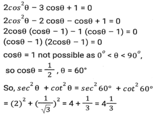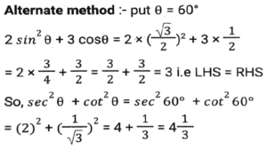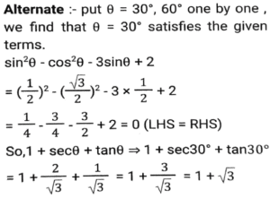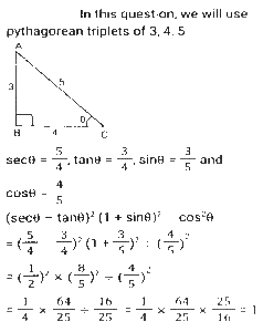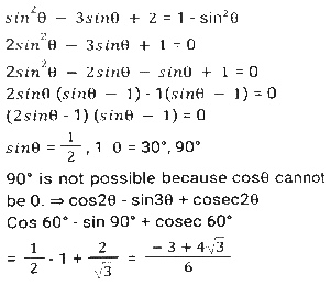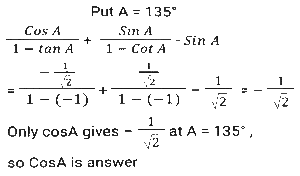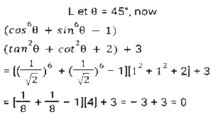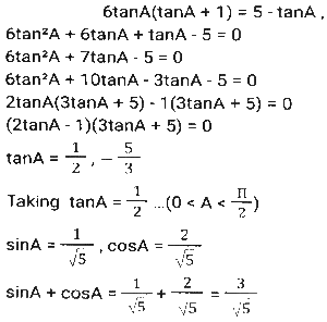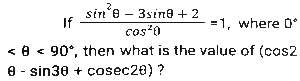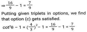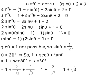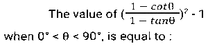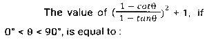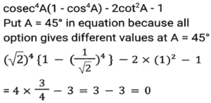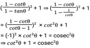 Trigonometry (Part-10)Total Questions: 5041. Simplify [SSC CGL 12/04/2022 (Aftrernoon)](a) cos²θ - 1(b) sec²θ + 1(c) cot²θ - 1(d) sin²θ - 1Correct Answer: (c) cot²θ - 1Solution:In this questions, we will put the value of pythagoras triplet.42. The expression (cos⁶θ + sin⁶θ - 1) (tan²θ + cot²θ + 2) + 3 is equal to: [SSC CGL 13/04/2022 (Afternoon)](a) 0(b) 1(c) 2(d) -1Correct Answer: (a) 0Solution:43. If sin²θ - cos²θ - 3sinθ + 2 = 0, 0º < θ < 90º, what is the value of 1 + secθ + tanθ ? [SSC CGL 13/04/2022 (Evening)](a) -1 +√3(b) -1 -√3(c) 1 + √3(d) 1 - √3Correct Answer: (c) 1 + √3Solution:44. (secθ - tanθ)² (1 + sinθ)² ÷ cosθ² = ? [SSC CGL 13/04/2022 (Evening)](a) cos²θ(b) 1(c) cot²θ(d) -1Correct Answer: (b) 1Solution:45. If 2 sin²θ + 3 cosθ = 3, 0º < θ < 90º, then the value of (sec²θ + cot²θ) is: [SSC CGL 18/04/2022 (Evening)](a)(b)(c)(d)Correct Answer: (c)Solution:46. Simplify the following expression: [SSC CGL 19/04/2022 (Evening)](a) 1 + Cos A(b) (1 + sin A) cosA(c) 1 + sinA(d) Cos ACorrect Answer: (d) Cos ASolution:47. Simplify the following expression: [SSC CGL 20/04/2022 (Morning)]cosec⁴A (1 - cos⁴A) - 2cot²A - 1(a) sin²A(b) cosec²A(c) 1(d) 0Correct Answer: (d) 0Solution:48. If 6tanA (tanA + 1) = 5 - tanA, Given that 0 < A < π/2 what is the value of (sinA + cosA) ? [SSC CGL 20/04/2022 (Morning)](a)(b)(c)(d)Correct Answer: (d)Solution:49. Simplify [SSC CGL 20/04/2022 (Evening)](a) cosec²θ(b) sin²θ(c) cos²θ(d) sec²θCorrect Answer: (a) cosec²θSolution:50. Simplify [SSC CGL 21/04/2022 (Afternoon)](a)(b)(c)(b)Correct Answer: (b)Solution:Submit Quiz« Previous12345